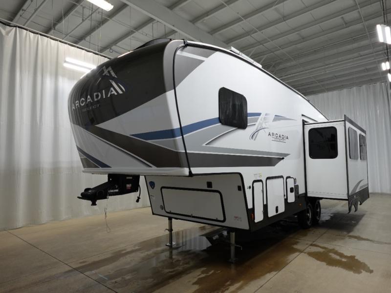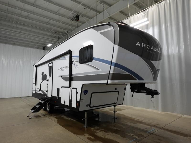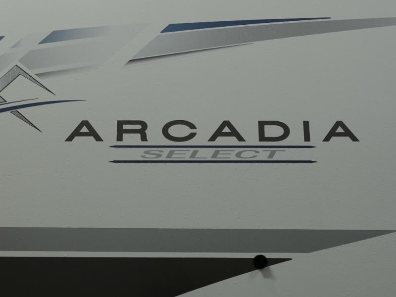With any Arcadia Select fifth wheel by Keystone you will enjoy easy towability and at-home comforts at an affordable price! The laminated sidewalls with five sided aluminum superstructure will provide a strong foundation so you can enjoy your RV for years to come, plus a one-piece, heated and enclosed polypropylene underbelly means you can camp year around! And an upgraded Roto-Flex hitch pin with will make it easy to tow. Head inside to find tall slides for added space, seamless, pressed countertops, convenient underbed storage, and a large shower with a retractable door and skylight. These fifth wheels also include a Blade Pure A/C system, Girard on-demand tankless water heater, two 30 lb. LP tanks, and more utilities to make your camping experience run smoothly.