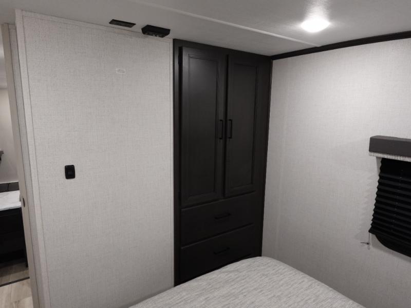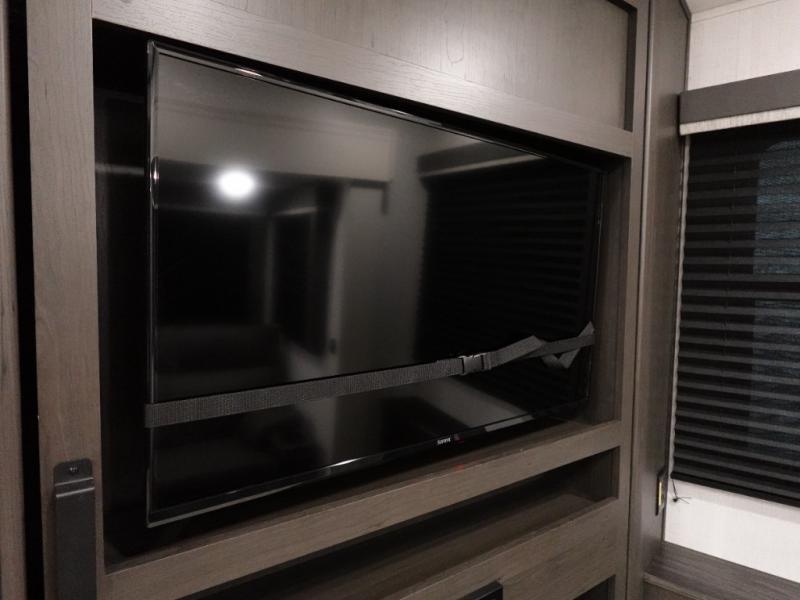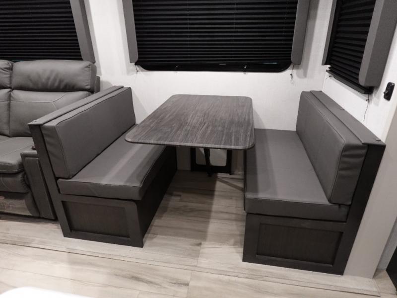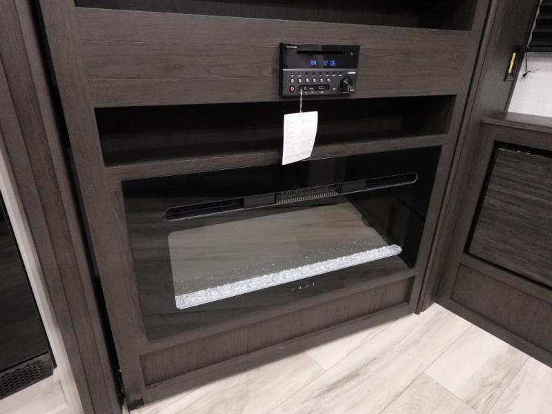 Trips to the lake are made complete in this spacious fifth wheel that can sleep five each night. You'll enjoy your own private bedroom up front that includes a queen bed, a wardrobe, plus bedside wardrobes and nightstands for your things. After you've made dinner on the cooktop, you can dine at the booth dinette. There is additional seating on the theater seats. A flip-up desk in the back will let you get some work done if needed, and the hidden walk-in pantry behind the TV/fireplace is a huge convenience!