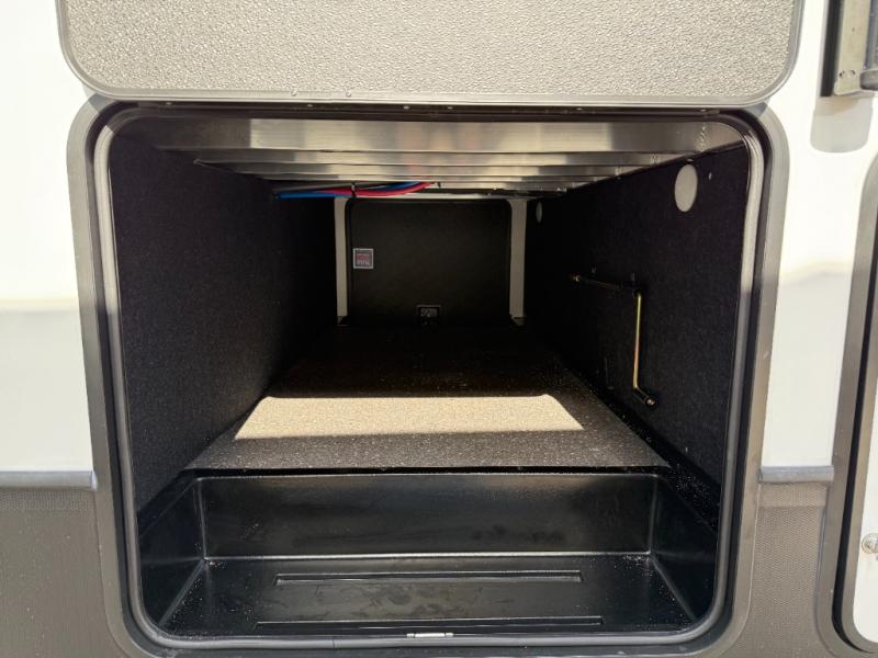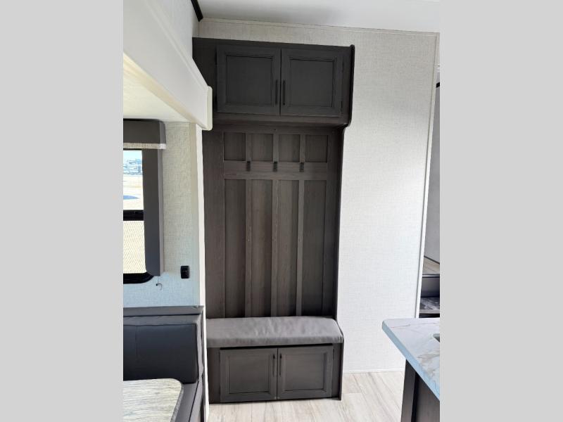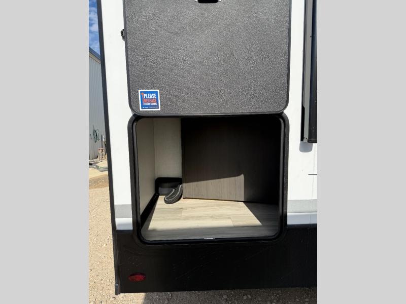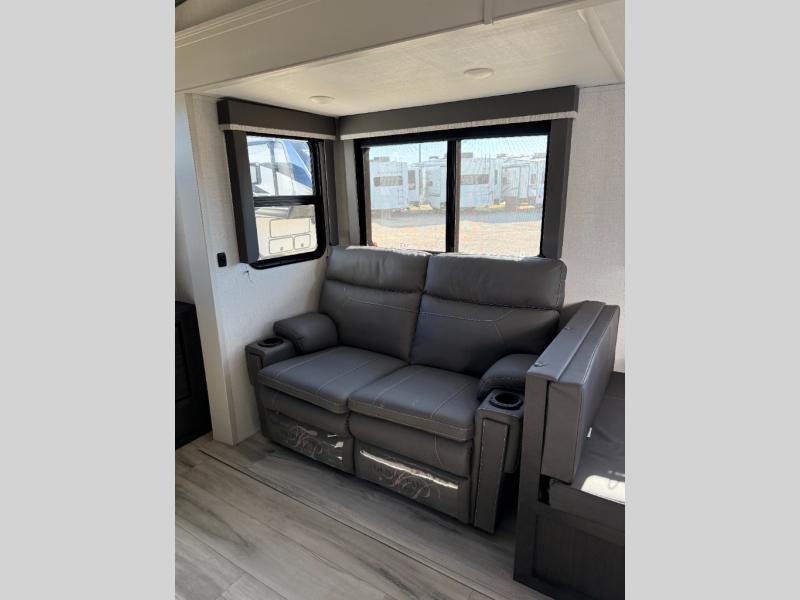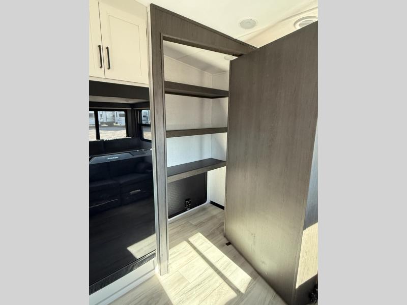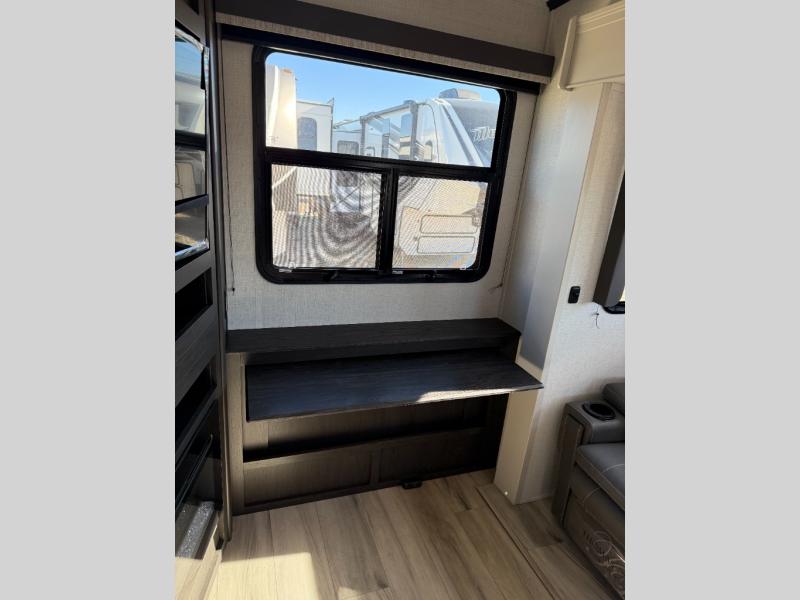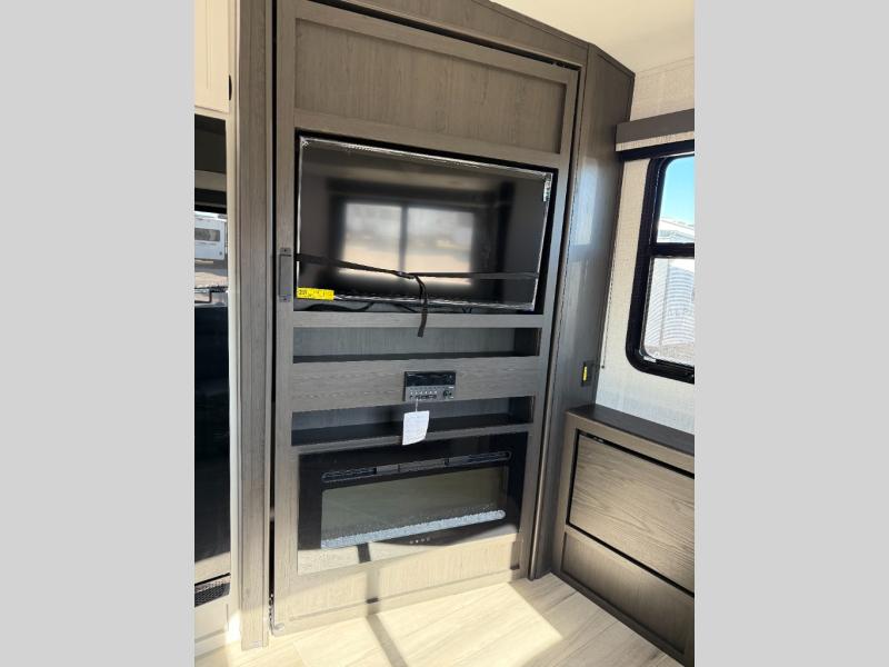 Trips to the lake are made complete in this spacious fifth wheel that can sleep five each night. You'll enjoy your own private bedroom up front that includes a queen bed, a wardrobe, plus bedside wardrobes and nightstands for your things. After you've made dinner on the cooktop, you can dine at the booth dinette. There is additional seating on the tri-fold sofa, and both of these areas can double as sleeping space for guests. If you're wanting a little more comfort, just choose the optional theater seating in place of the sofa. A flip-up desk in the back will let you get some work done if needed, and the hidden walk-in pantry behind the TV/fireplace is a huge convenience!