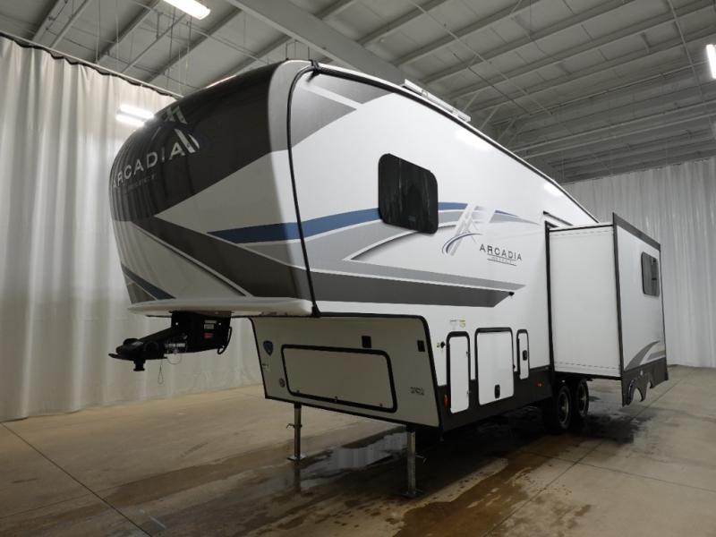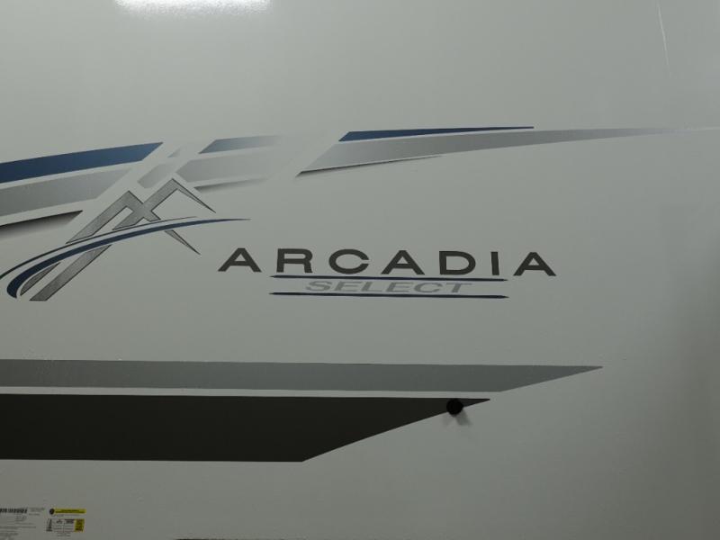 With any Arcadia Select fifth wheel by Keystone you will enjoy easy towability and at-home comforts at an affordable price! The laminated sidewalls with five sided aluminum superstructure will provide a strong foundation so you can enjoy your RV for years to come, plus a one-piece, heated and enclosed polypropylene underbelly means you can camp year around! And an upgraded Roto-Flex hitch pin with will make it easy to tow. Head inside to find tall slides for added space, seamless, pressed countertops, convenient underbed storage, and a large shower with a retractable door and skylight. These fifth wheels also include a Blade Pure A/C system, Girard on-demand tankless water heater, two 30 lb. LP tanks, and more utilities to make your camping experience run smoothly.