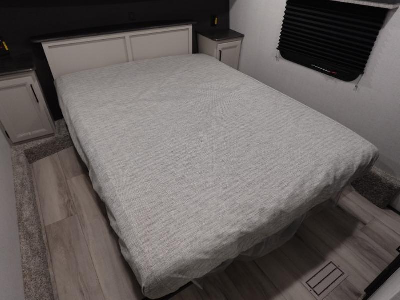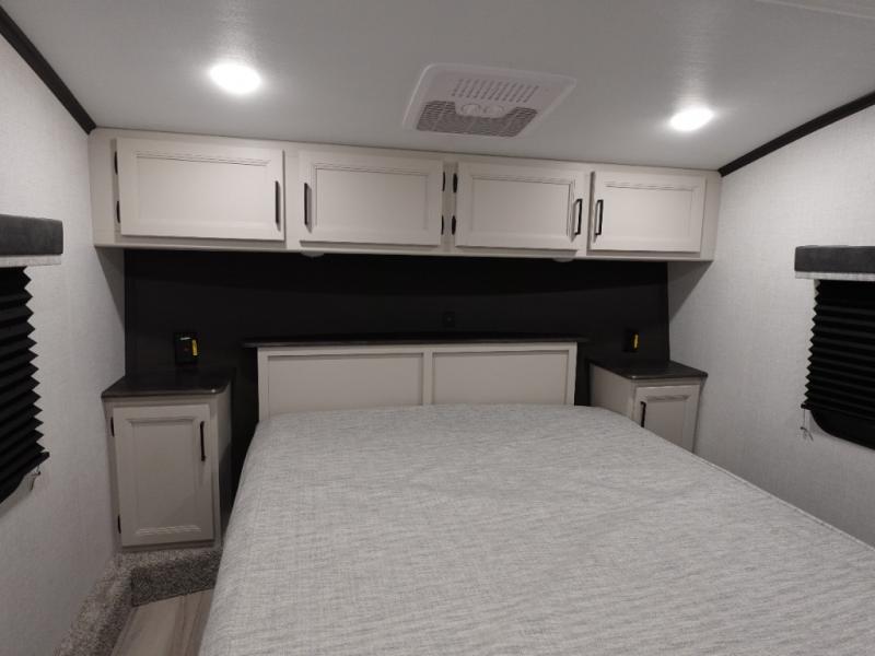 Trips to the lake are made complete in this spacious fifth wheel that can sleep six each night. You'll enjoy your own private bedroom up front that includes a queen bed, a wardrobe, plus bedside wardrobes and nightstands for your things. After you've made dinner on the cooktop, you can dine around the rear U-shaped dinette. There is additional seating on the tri-fold sofa, and both of these areas can double as sleeping space for guests.