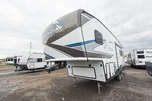 With any Arcadia Select fifth wheel by Keystone you will enjoy easy towability and at-home comforts at an affordable price! The laminated sidewalls with five sided aluminum superstructure will provide a strong foundation so you can enjoy your RV for years to come, plus a one-piece, heated and enclosed polypropylene underbelly means you can camp year around! And an upgraded Roto-Flex hitch pin with will make it easy to tow. Head inside to find tall slides for added space, seamless, pressed countertops, convenient underbed storage, and a large shower with a retractable door and skylight. These fifth wheels also include a Blade Pure A/C system, Girard on-demand tankless water heater, two 30 lb. LP tanks, and more utilities to make your camping experience run smoothly.