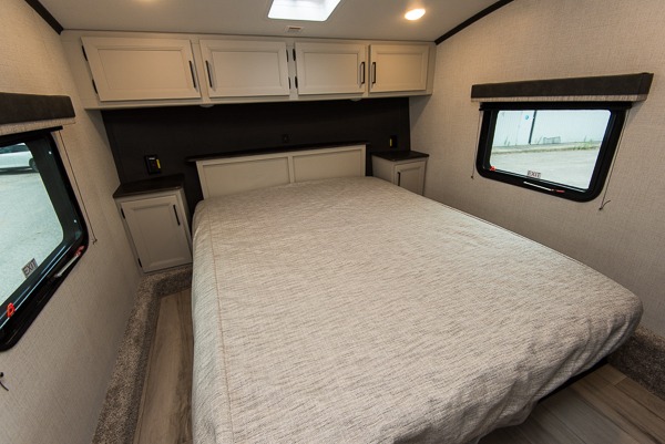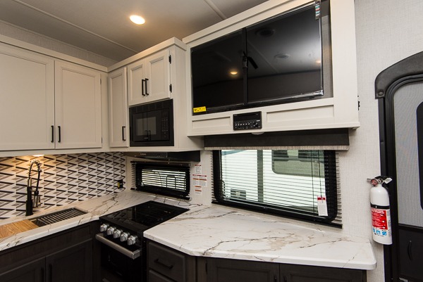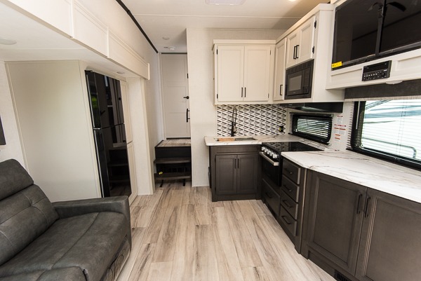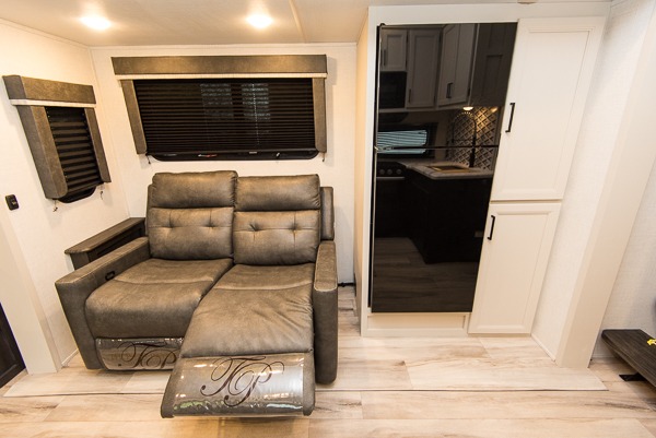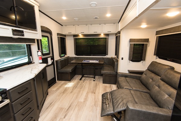 Trips to the lake are made complete in this spacious fifth wheel that can sleep six each night. You'll enjoy your own private bedroom up front that includes a queen bed, a wardrobe, plus bedside wardrobes and nightstands for your things. After you've made dinner on the cooktop, you can dine around the rear U-shaped dinette. There is additional seating on the tri-fold sofa, and both of these areas can double as sleeping space for guests. If you're wanting a little more comfort, just choose the optional theater seating in place of the sofa.