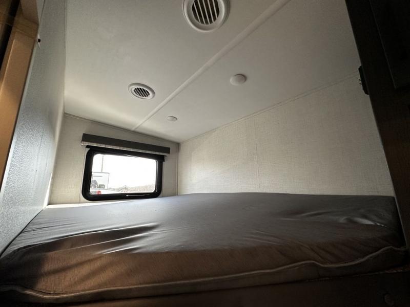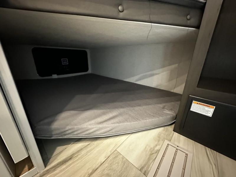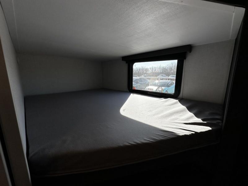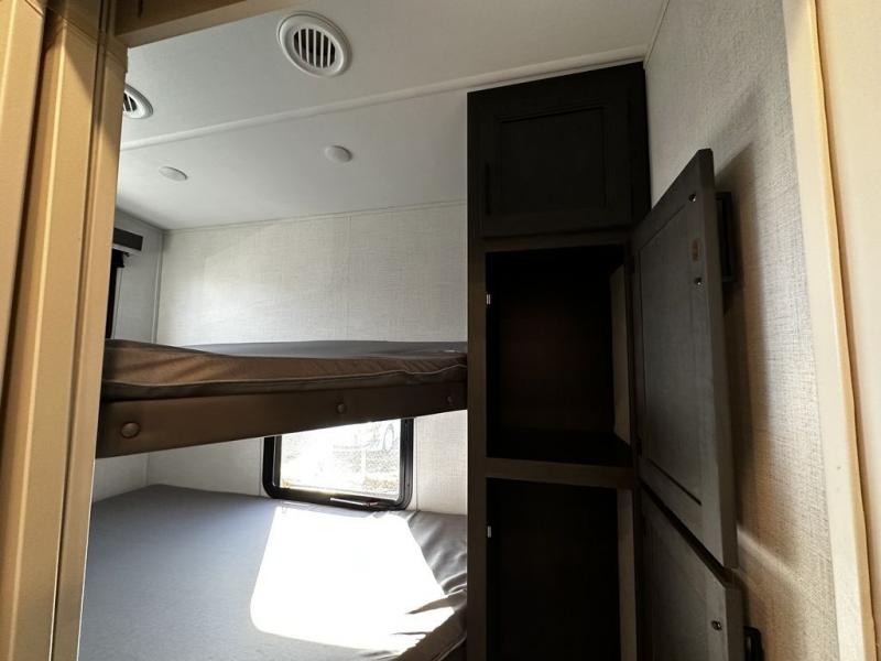 This fifth wheel with an open concept kitchen and living area is sure to feel just like home! You can relax with friends and family around the U-shaped dinette or on the tri-fold sleeper sofa, and there is a TV/radio in this space for entertainment. The rear private bunkhouse includes double-size triple bunks and a wardrobe for your guests' things, and you'll have your own wardrobes up front in the private bedroom. There is also a queen bed here and dual nightstands to keep your phone and glasses close by. And don't overlook the exterior with its 20' electric awning and LCI Solid Steps!