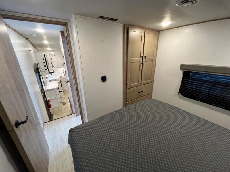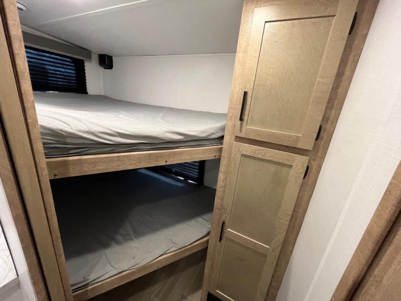 This fifth wheel with an open concept kitchen and living area is sure to feel just like home! You can relax with friends and family around the U-shaped dinette or on the tri-fold sleeper sofa, and there is a TV/radio in this space for entertainment. The rear private bunkhouse includes double-size triple bunks and a wardrobe for your guests' things, and you'll have your own wardrobes up front in the private bedroom. There is also a queen bed here and dual nightstands to keep your phone and glasses close by. And don't overlook the exterior with its 20' electric awning and LCI Solid Steps!