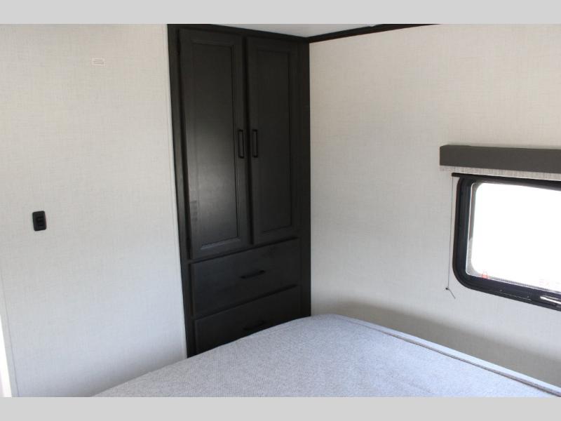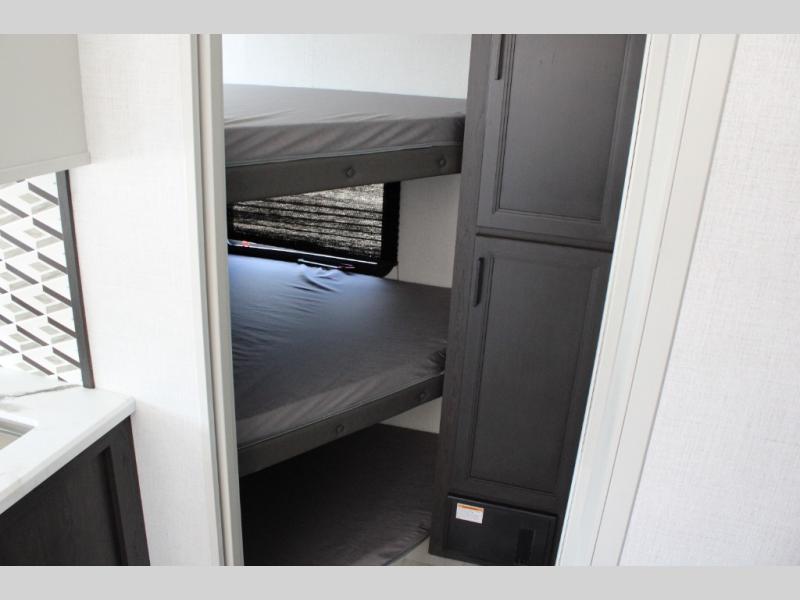 This fifth wheel with an open concept kitchen and living area is sure to feel just like home! You can relax with friends and family around the U-shaped dinette or on the tri-fold sleeper sofa, and there is a TV/radio in this space for entertainment. The rear private bunkhouse includes double-size triple bunks and a wardrobe for your guests' things, and you'll have your own wardrobes up front in the private bedroom. There is also a queen bed here and dual nightstands to keep your phone and glasses close by. And don't overlook the exterior with its 20' electric awning and LCI Solid Steps!
