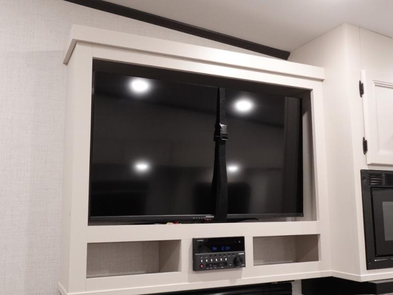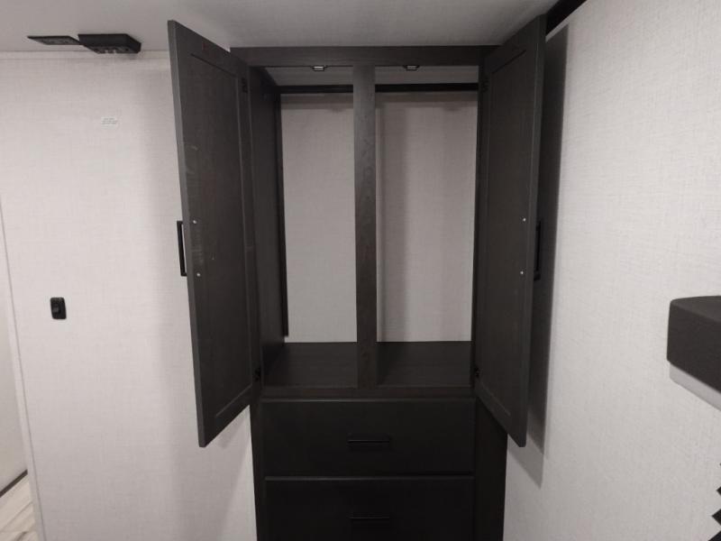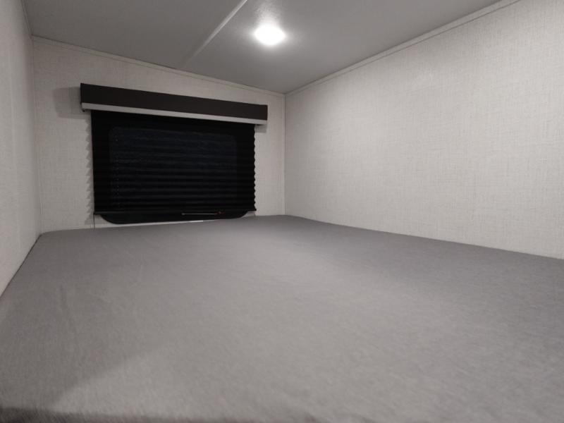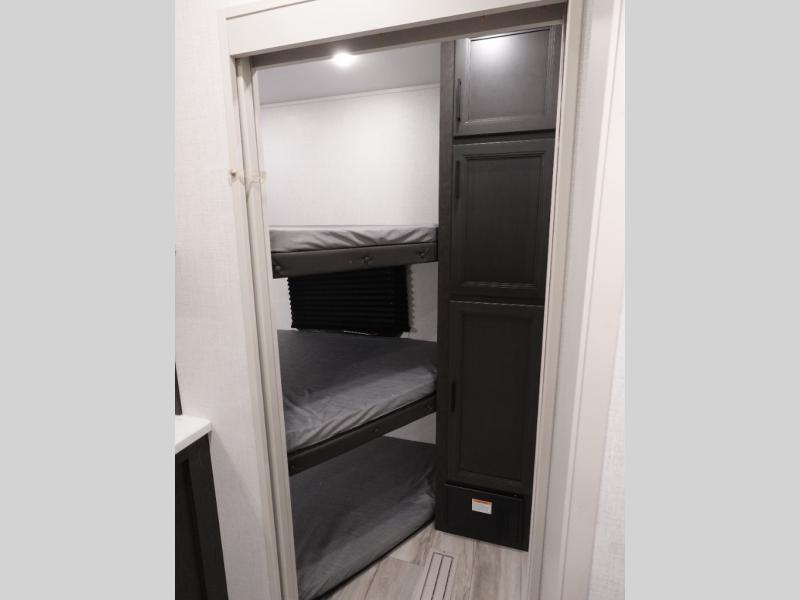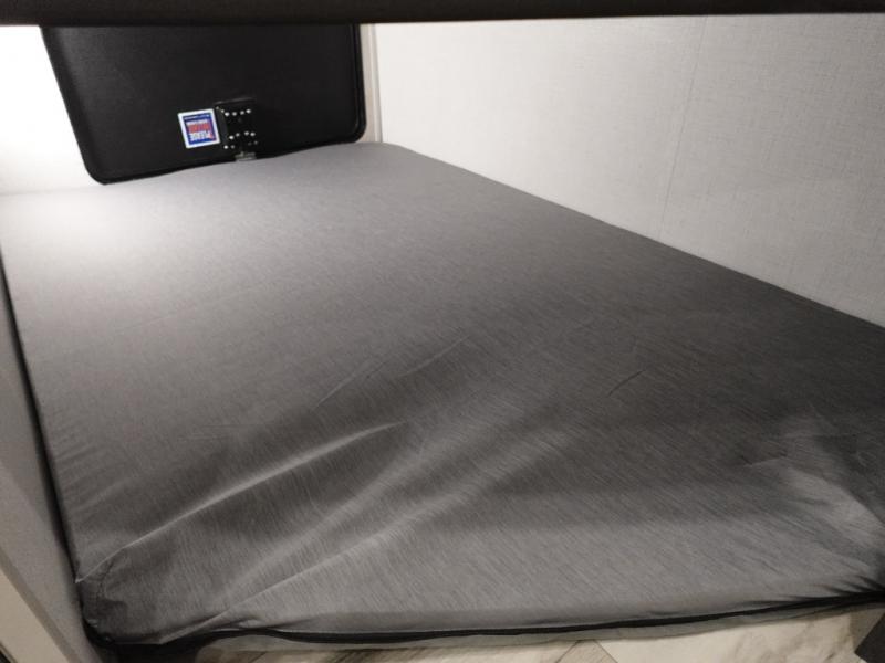 This fifth wheel with an open concept kitchen and living area is sure to feel just like home! You can relax with friends and family around the U-shaped dinette or on the tri-fold sleeper sofa, and there is a TV/radio in this space for entertainment. The rear private bunkhouse includes double-size triple bunks and a wardrobe for your guests' things, and you'll have your own wardrobes up front in the private bedroom. There is also a queen bed here and dual nightstands to keep your phone and glasses close by. And don't overlook the exterior with its 20' electric awning and LCI Solid Steps!