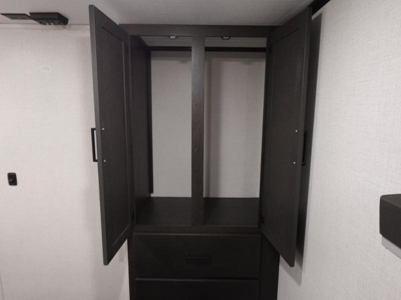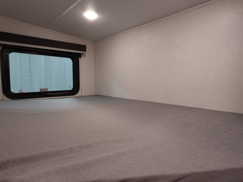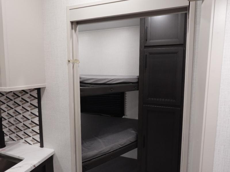 This fifth wheel with an open concept kitchen and living area is sure to feel just like home! You can relax with friends and family around the U-shaped dinette or on the tri-fold sleeper sofa, and there is a TV/radio in this space for entertainment. The rear private bunkhouse includes double-size triple bunks and a wardrobe for your guests' things, and you'll have your own wardrobes up front in the private bedroom. There is also a queen bed here and dual nightstands to keep your phone and glasses close by. And don't overlook the exterior with its 20' electric awning and LCI Solid Steps!