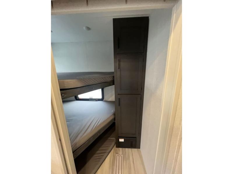 This fifth wheel with an open concept kitchen and living area is sure to feel just like home! You can relax with friends and family around the U-shaped dinette or on the tri-fold sleeper sofa, and there is a TV/radio in this space for entertainment. The rear private bunkhouse includes double-size triple bunks and a wardrobe for your guests' things, and you'll have your own wardrobes up front in the private bedroom. There is also a queen bed here and dual nightstands to keep your phone and glasses close by. And don't overlook the exterior with its 20' electric awning and LCI Solid Steps!