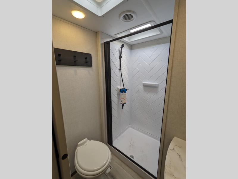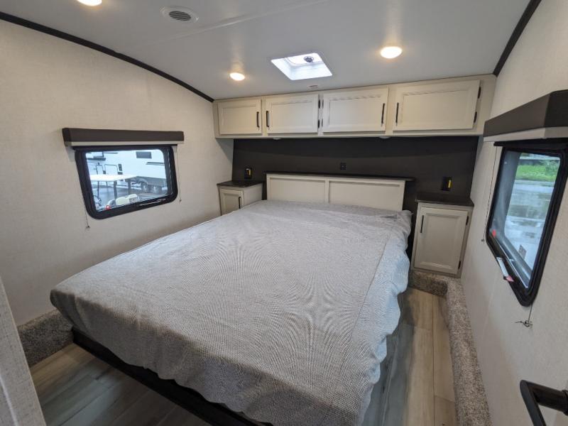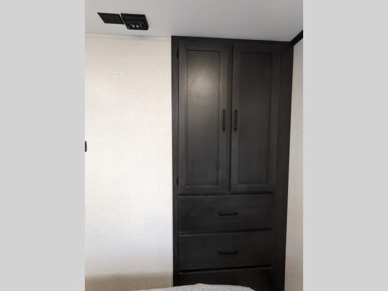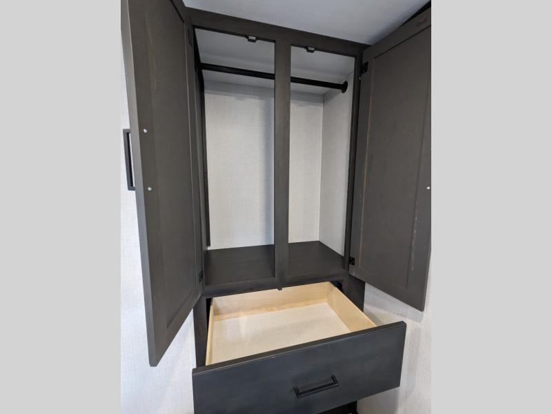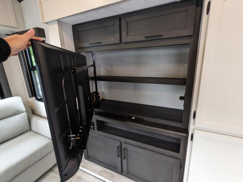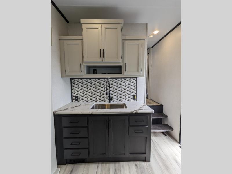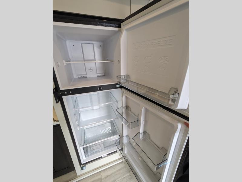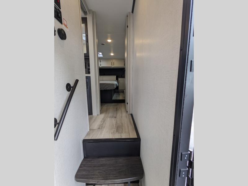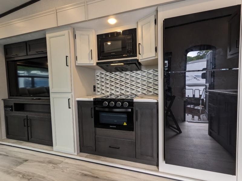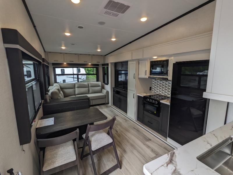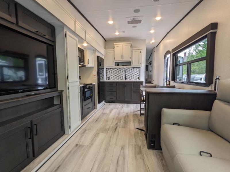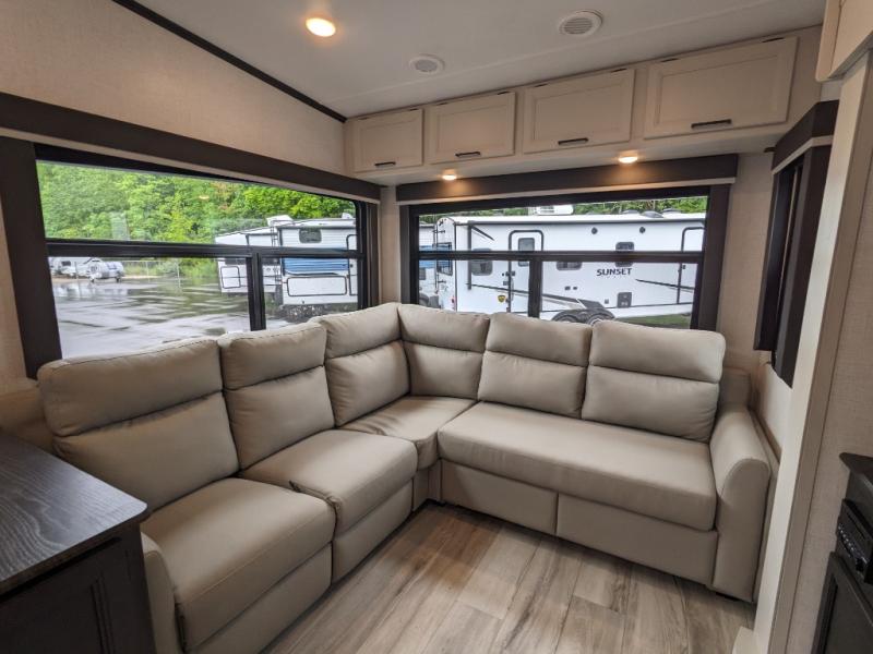 This fifth wheel will be the best RV vehicle for you and your family. Built to offer the ultimate comfort, this fifth wheel has a spacious living area that boasts a tri-fold sofa and sofa with recliners, perfect to rest while enjoying your tour favorites shows in the fabulous entertainment center. You can cook like a Michelin star chef in the incredible kitchen, fitted with a convection microwave, refrigerator, and three-burner range. Also, the overhead cabinets and pantry will allow you to keep all your food and spices organized on the go, and when your meal is done, you can enjoy it in the comfortable dinette. Convenience is our top priority; that is why the full bathroom is equipped with everything needed to take a nice shower. Finally, retreat to the comfortable queen bed, ideal for a deserved good night's rest.