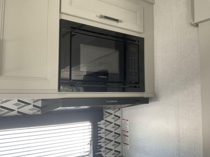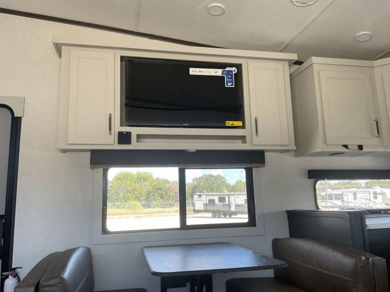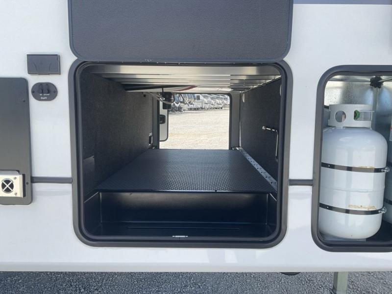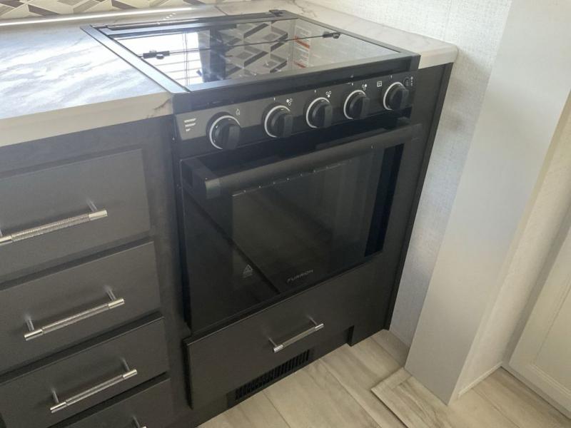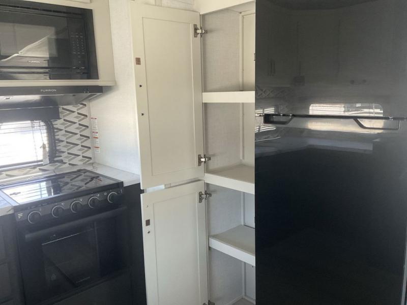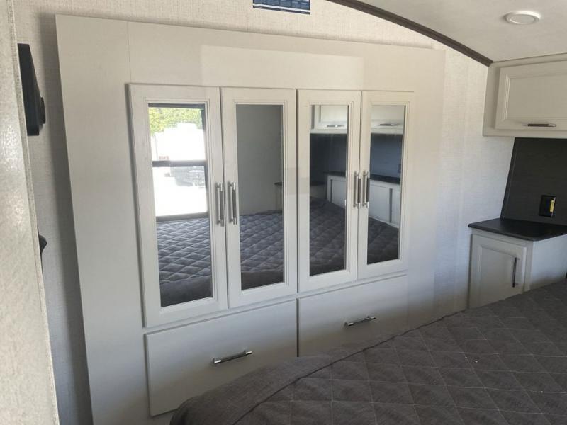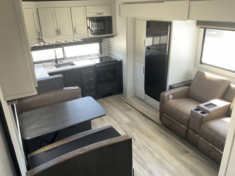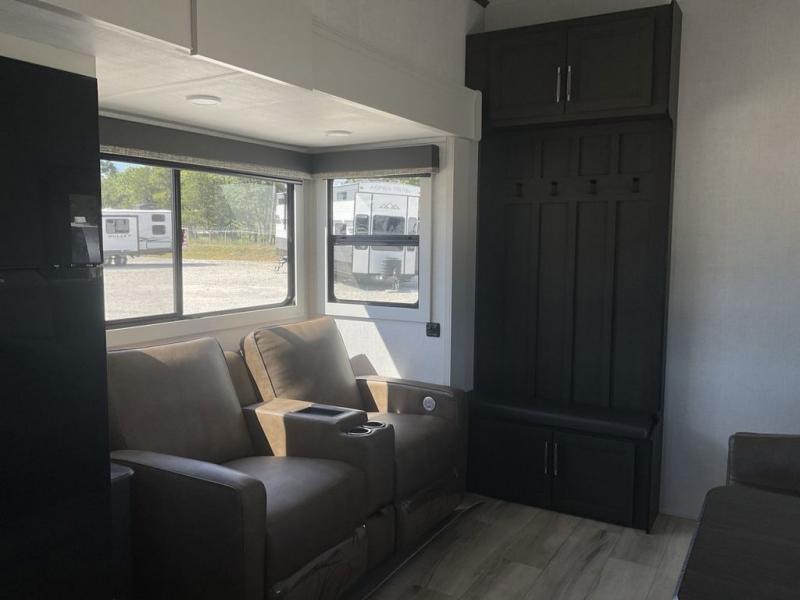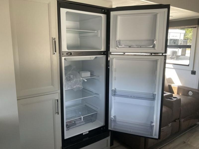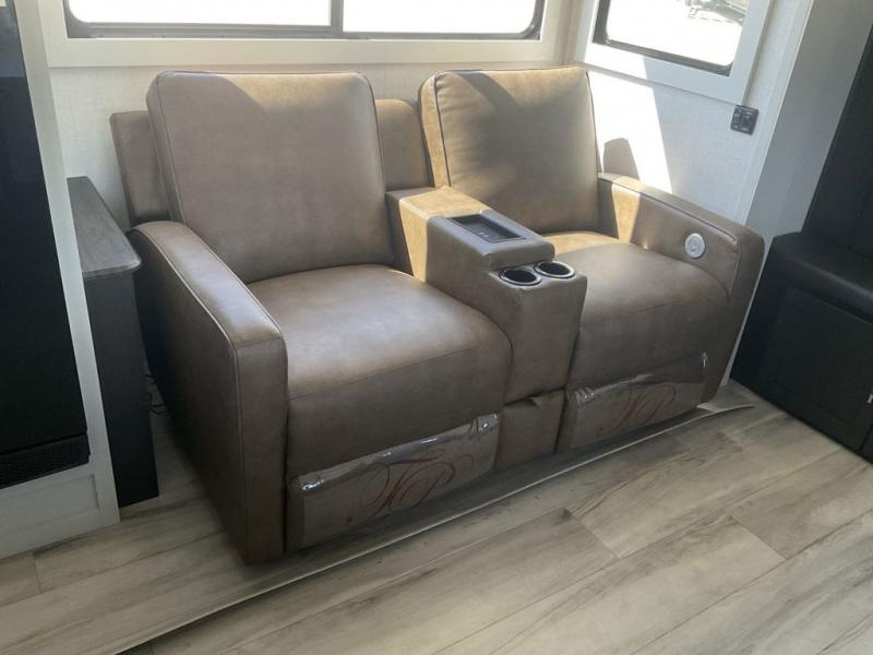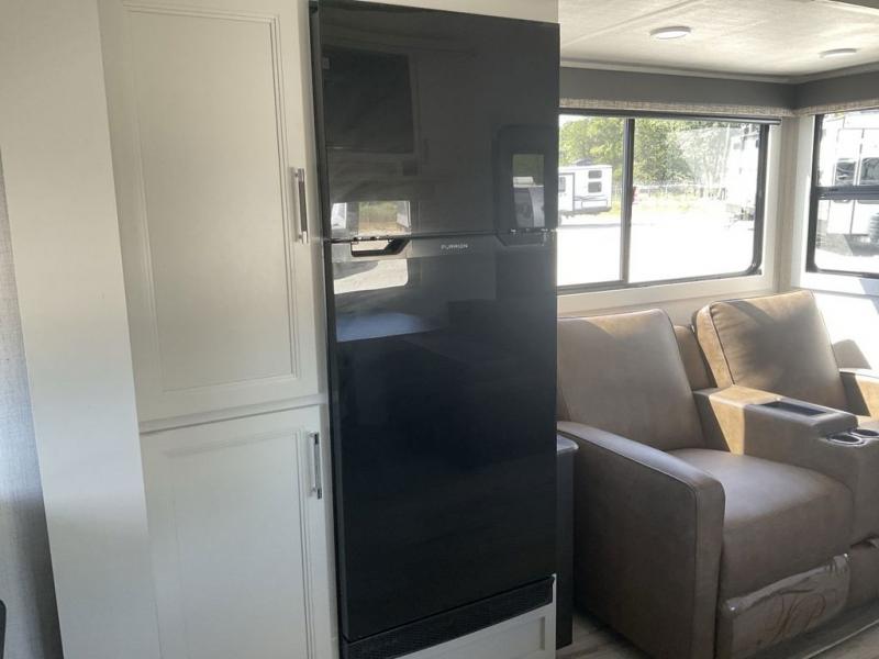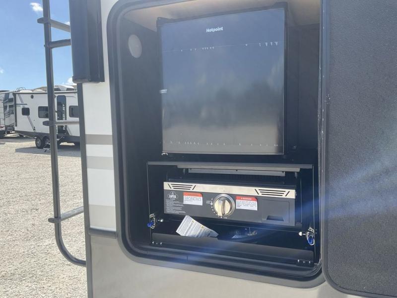 This rear kitchen fifth wheel is packed with features to make each trip memorable! Once you've arrived at the campground and set up the 21' electric awning, you can start lunch on the Grill-N-Chill outdoor kitchen before heading inside. If the weather isn't cooperating, you'll find a 21" Furrion range and microwave oven in the rear kitchen to whip up a meal. There is also a pantry and 10 cu. ft. 12V "Solar Friendly" refrigerator for food storage. The theater seating will provide a place for you to relax in the evenings, and the full bath with a spacious shower means you can clean up before bed. Speaking of bedtime, the front private bedroom includes a queen bed for a great night's rest. There are also dual nightstands and a wardrobe slide to keep your space tidy!