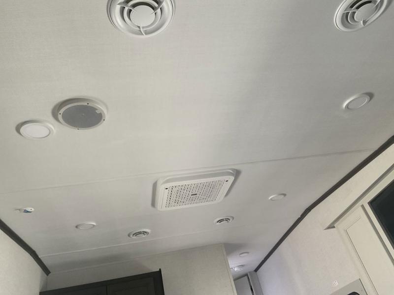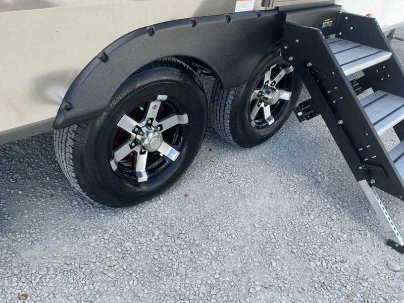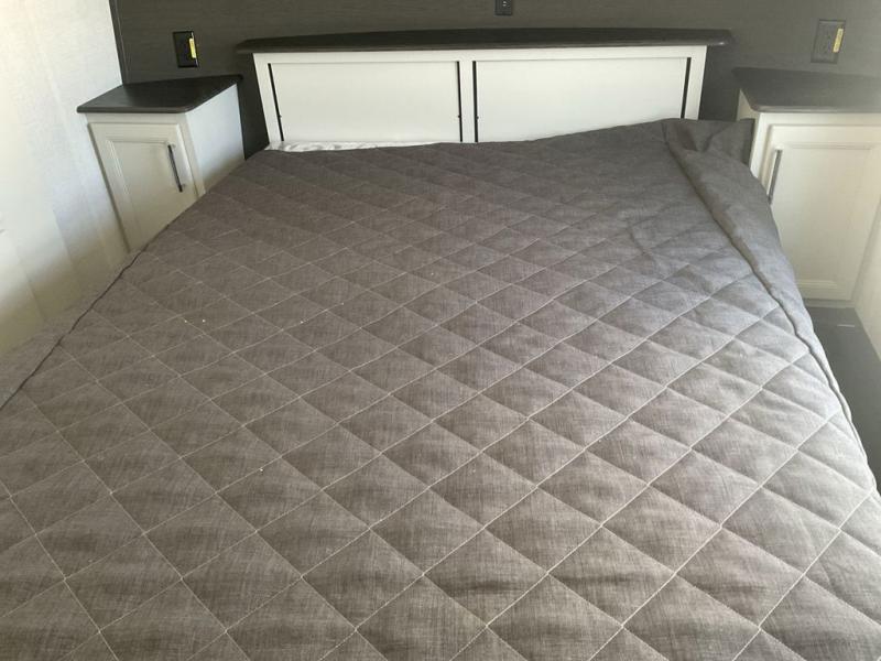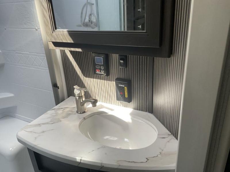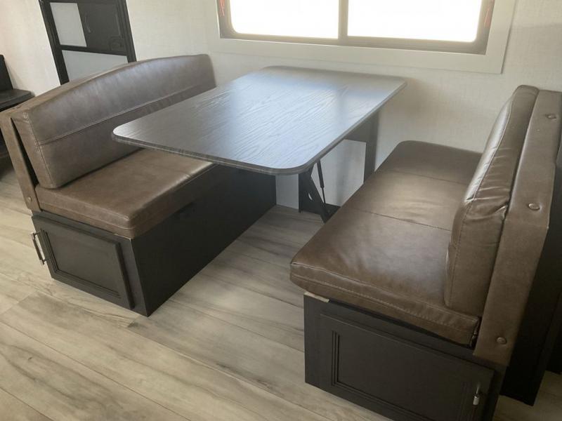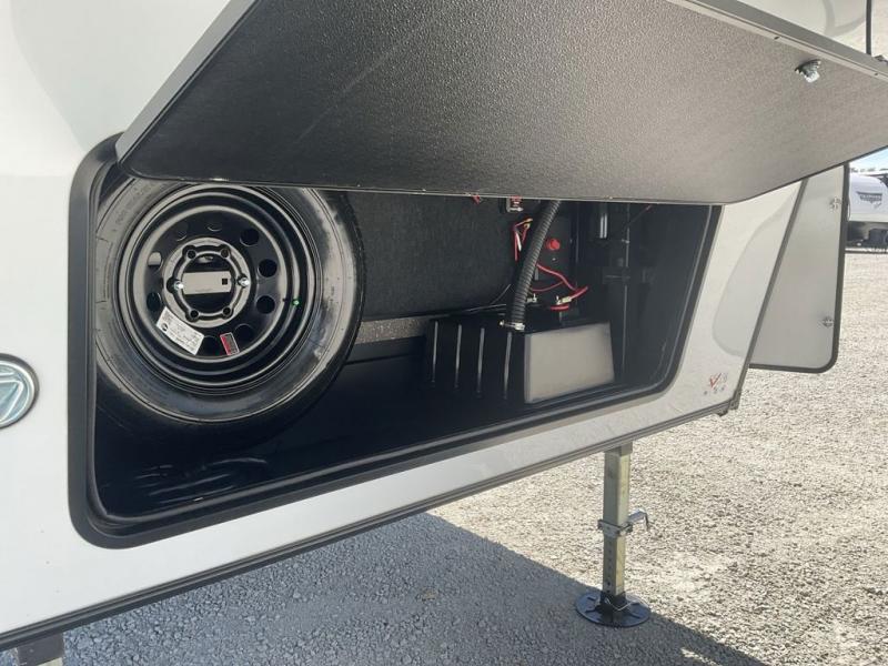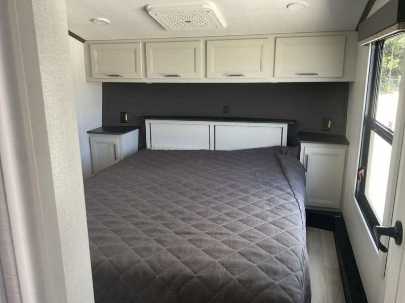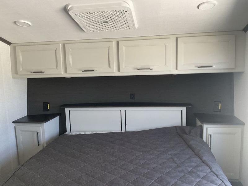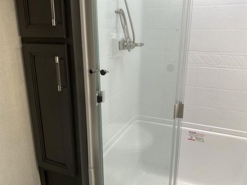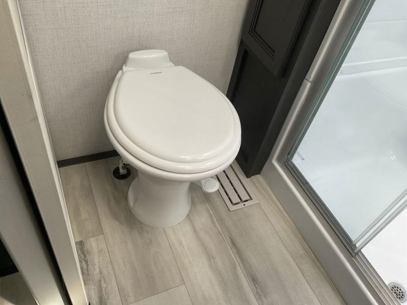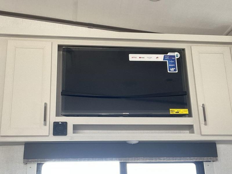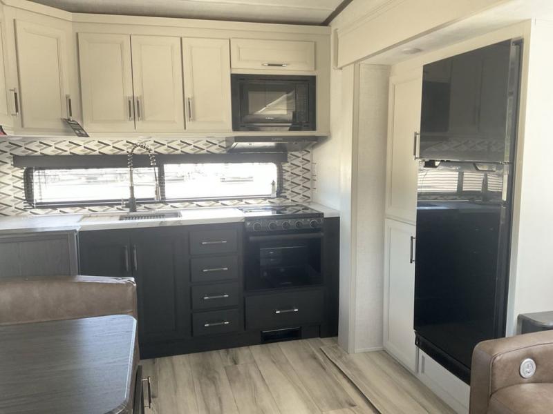 This rear kitchen fifth wheel is packed with features to make each trip memorable! Once you've arrived at the campground and set up the 21' electric awning, you can start lunch on the Grill-N-Chill outdoor kitchen before heading inside. If the weather isn't cooperating, you'll find a 21" Furrion range and microwave oven in the rear kitchen to whip up a meal. There is also a pantry and 10 cu. ft. 12V "Solar Friendly" refrigerator for food storage. The theater seating will provide a place for you to relax in the evenings, and the full bath with a spacious shower means you can clean up before bed. Speaking of bedtime, the front private bedroom includes a queen bed for a great night's rest. There are also dual nightstands and a wardrobe slide to keep your space tidy!