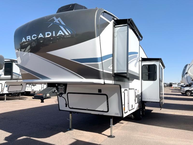 With any Arcadia Super Lite fifth wheel by Keystone, you will enjoy easy-to-tow lengths, unmatched storage, and oversized windows to let the outdoor views in. The structural I-beam frame will provide a strong foundation to your RV, and the Curt Performance Package means you can enjoy hassle-free towing. You will be able to camp year around thanks to the Peak Weather Package that includes a heated and enclosed underbelly, a 35K BTU furnace, and Keystone's exclusive HyperDeck floor that adds an additional layer of insulation to your floor. The interior will make you feel at home with residential hardware, seamless pressed countertops, black roller shades, and ample storage space. Sometimes the best things come in smaller packages; choose a Arcadia Super Lite today!