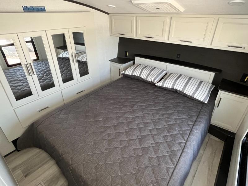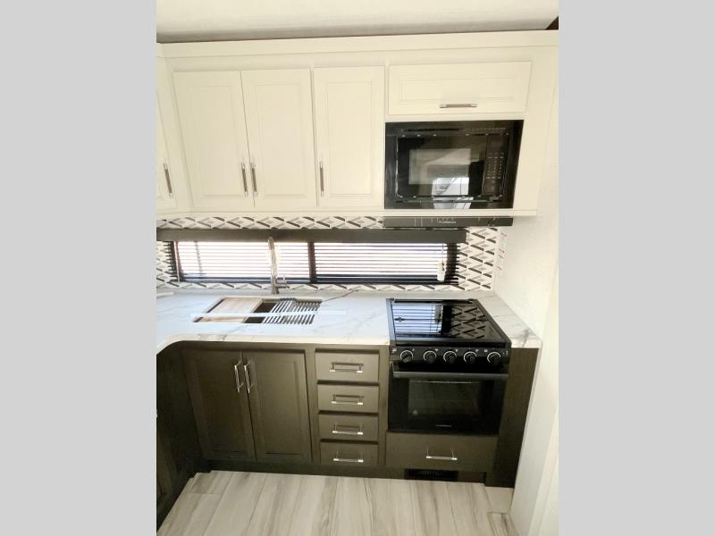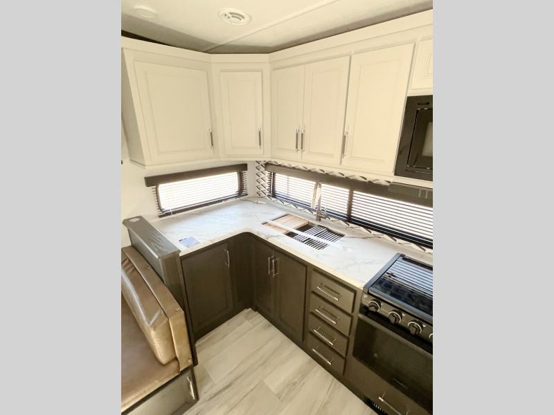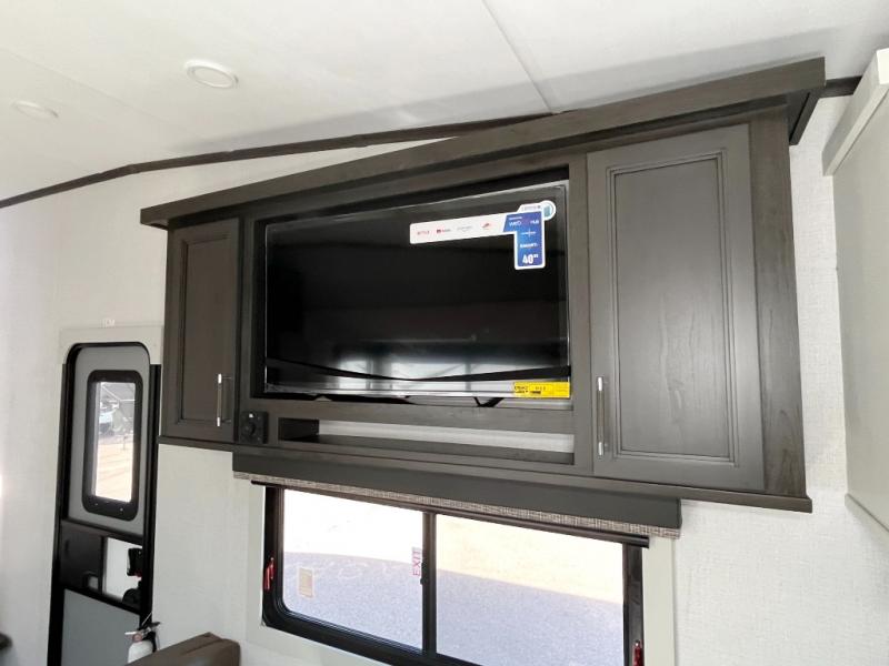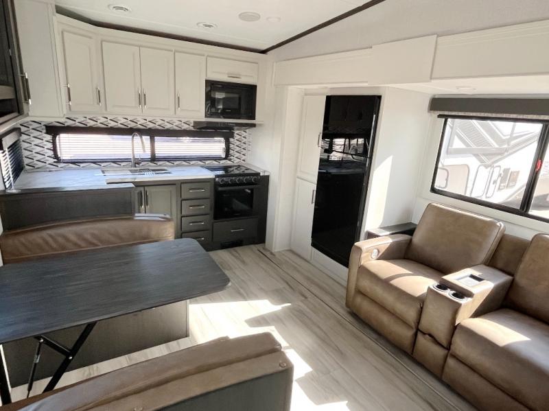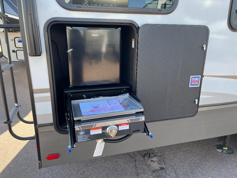 This rear kitchen fifth wheel is packed with features to make each trip memorable! Once you've arrived at the campground and set up the 21' electric awning, you can start lunch on the Grill-N-Chill outdoor kitchen before heading inside. If the weather isn't cooperating, you'll find a 21" Furrion range and microwave oven in the rear kitchen to whip up a meal. There is also a pantry and 10 cu. ft. 12V "Solar Friendly" refrigerator for food storage. The theater seating will provide a place for you to relax in the evenings, and the full bath with a spacious shower means you can clean up before bed. Speaking of bedtime, the front private bedroom includes a queen bed for a great night's rest. There are also dual nightstands and a wardrobe slide to keep your space tidy!