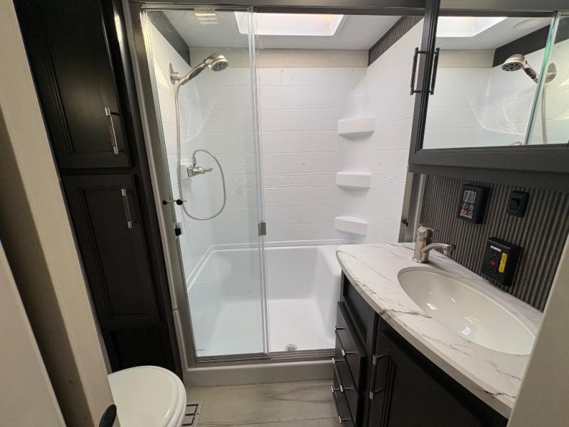 This rear kitchen fifth wheel is packed with features to make each trip memorable! Once you've arrived at the campground and set up the 21' electric awning, you can start lunch on the Grill-N-Chill outdoor kitchen before heading inside. If the weather isn't cooperating, you'll find a 21" Furrion range and microwave oven in the rear kitchen to whip up a meal. There is also a pantry and 10 cu. ft. 12V "Solar Friendly" refrigerator for food storage. The theater seating will provide a place for you to relax in the evenings, and the full bath with a spacious shower means you can clean up before bed. Speaking of bedtime, the front private bedroom includes a queen bed for a great night's rest. There are also dual nightstands and a wardrobe slide to keep your space tidy!