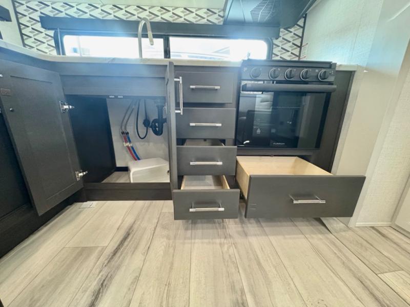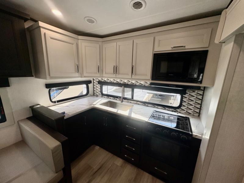 At the heart of the Arcadia Super Lite 242SLMD is a gourmet-inspired kitchen built for real cooking anywhere. With solid surface countertops, quality appliances, a well-placed sink, and plenty of cabinet storage, this kitchen makes meal prep easy and enjoyable. From quick breakfasts before heading out to scenic hikes to family dinners after sunset, you’ll appreciate the convenience and style this kitchen provides.