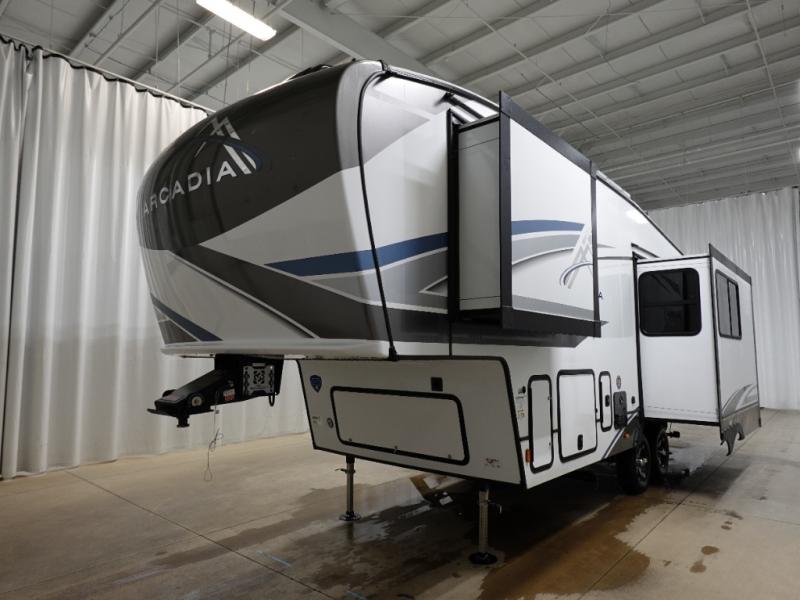 With any Arcadia Super Lite fifth wheel by Keystone, you will enjoy easy-to-tow lengths, unmatched storage, and oversized windows to let the outdoor views in. The structural I-beam frame will provide a strong foundation to your RV, and the Curt Performance Package means you can enjoy hassle-free towing. You will be able to camp year around thanks to the Peak Weather Package that includes a heated and enclosed underbelly, a 35K BTU furnace, and Keystone's exclusive HyperDeck floor that adds an additional layer of insulation to your floor. The interior will make you feel at home with residential hardware, seamless pressed countertops, black roller shades, and ample storage space. Sometimes the best things come in smaller packages; choose a Arcadia Super Lite today!