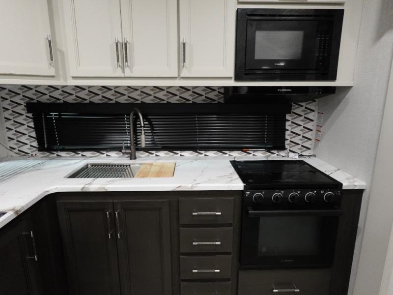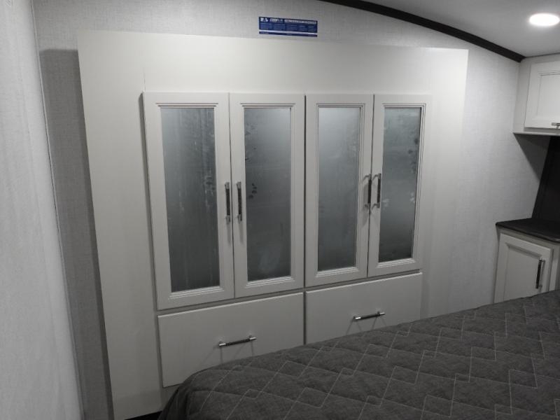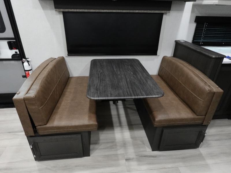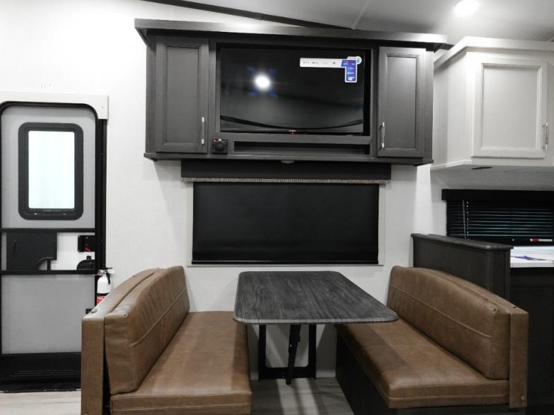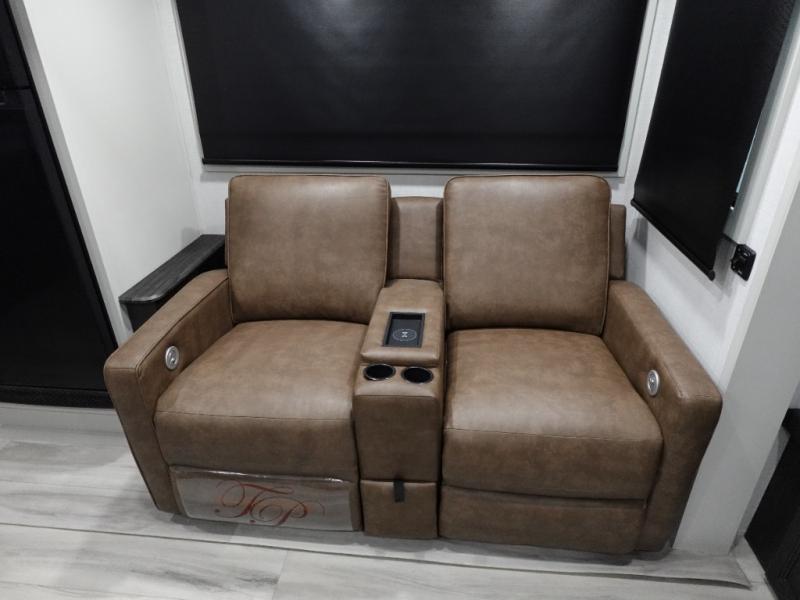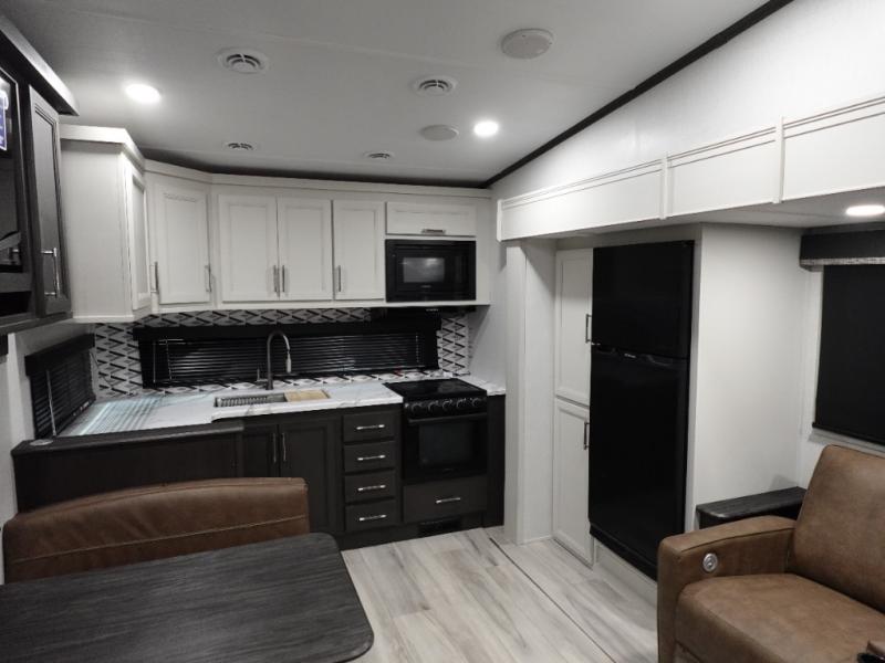 This rear kitchen fifth wheel is packed with features to make each trip memorable! Once you've arrived at the campground and set up the 21' electric awning, you can start lunch on the Grill-N-Chill outdoor kitchen before heading inside. If the weather isn't cooperating, you'll find a 21" Furrion range and microwave oven in the rear kitchen to whip up a meal. There is also a pantry and 10 cu. ft. 12V "Solar Friendly" refrigerator for food storage. The theater seating will provide a place for you to relax in the evenings, and the full bath with a spacious shower means you can clean up before bed. Speaking of bedtime, the front private bedroom includes a queen bed for a great night's rest. There are also dual nightstands and a wardrobe slide to keep your space tidy!