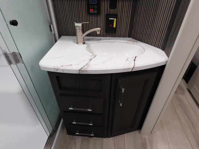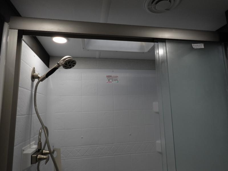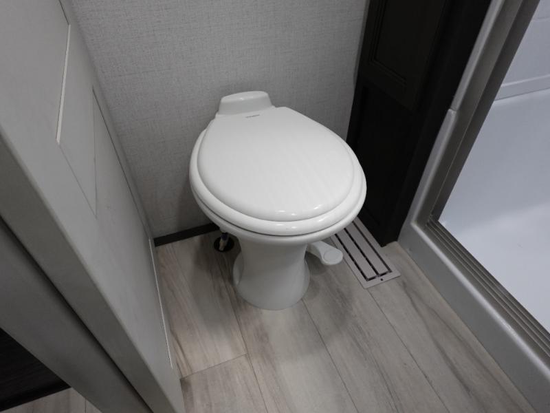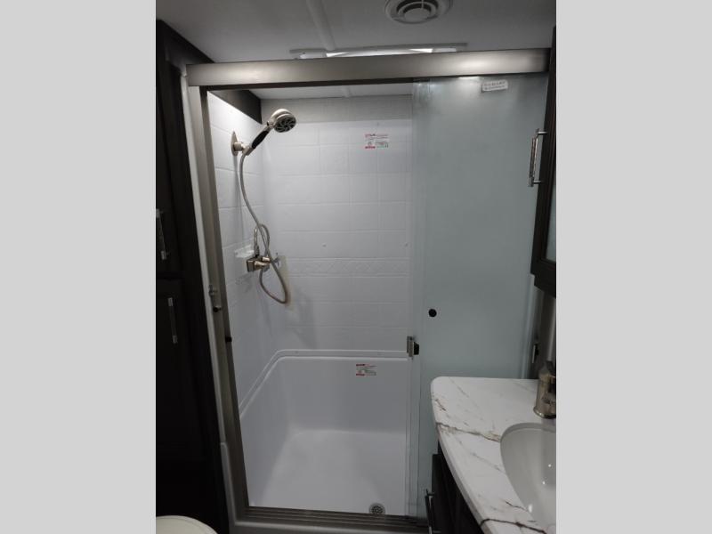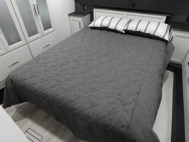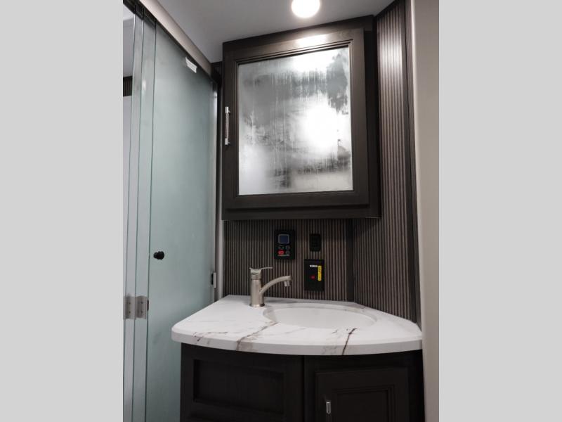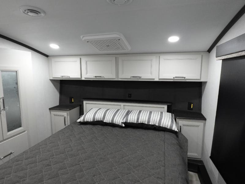 This rear kitchen fifth wheel is packed with features to make each trip memorable! Once you've arrived at the campground and set up the 21' electric awning, you can start lunch on the Grill-N-Chill outdoor kitchen before heading inside. If the weather isn't cooperating, you'll find a 21" Furrion range and microwave oven in the rear kitchen to whip up a meal. There is also a pantry and 10 cu. ft. 12V "Solar Friendly" refrigerator for food storage. The theater seating will provide a place for you to relax in the evenings, and the full bath with a spacious shower means you can clean up before bed. Speaking of bedtime, the front private bedroom includes a queen bed for a great night's rest. There are also dual nightstands and a wardrobe slide to keep your space tidy!