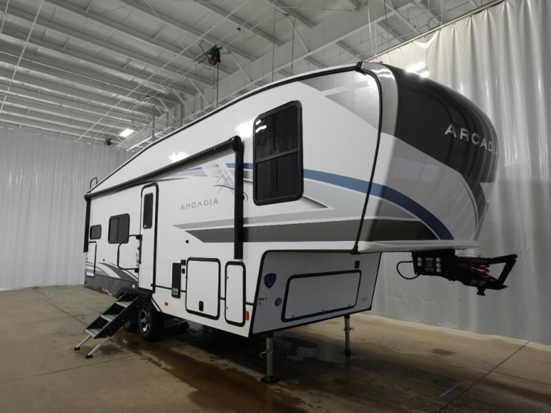 With any Arcadia Super Lite fifth wheel by Keystone, you will enjoy easy-to-tow lengths, unmatched storage, and oversized windows to let the outdoor views in. The structural I-beam frame will provide a strong foundation to your RV, and the Curt Performance Package means you can enjoy hassle-free towing. You will be able to camp year around thanks to the Peak Weather Package that includes a heated and enclosed underbelly, a 35K BTU furnace, and Keystone's exclusive HyperDeck floor that adds an additional layer of insulation to your floor. The interior will make you feel at home with residential hardware, seamless pressed countertops, black roller shades, and ample storage space. Sometimes the best things come in smaller packages; choose a Arcadia Super Lite today!