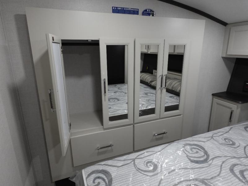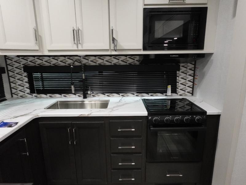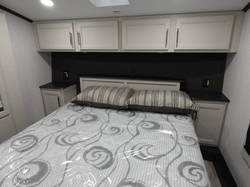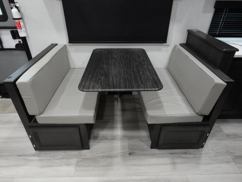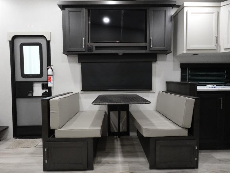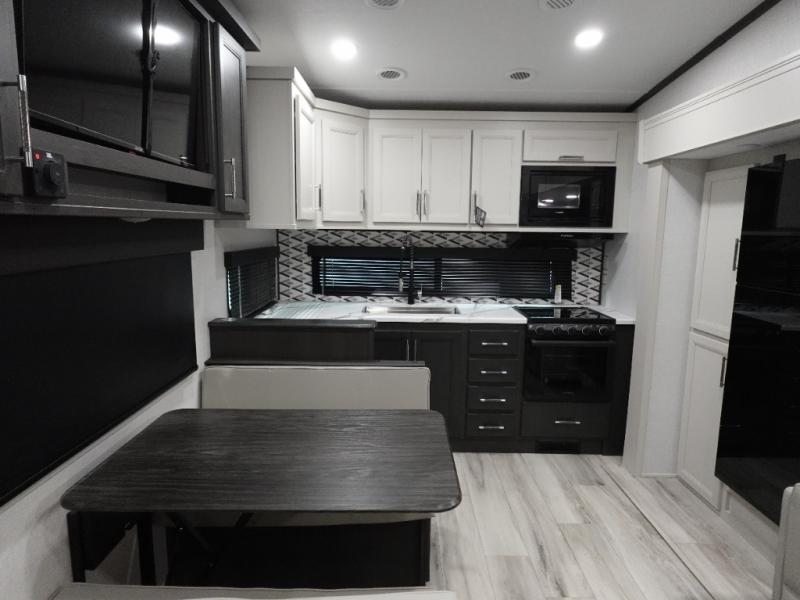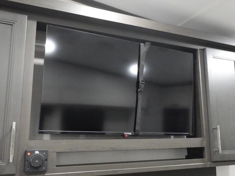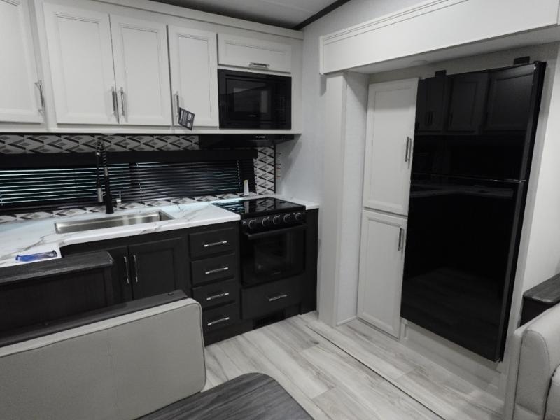 This rear kitchen fifth wheel is packed with features to make each trip memorable! Once you've arrived at the campground and set up the 21' electric awning, you can start lunch on the Grill-N-Chill outdoor kitchen before heading inside. If the weather isn't cooperating, you'll find a 21" Furrion range and microwave oven in the rear kitchen to whip up a meal. There is also a pantry and 10 cu. ft. 12V "Solar Friendly" refrigerator for food storage. The theater seating will provide a place for you to relax in the evenings, and the full bath with a spacious shower means you can clean up before bed. Speaking of bedtime, the front private bedroom includes a queen bed for a great night's rest. There are also dual nightstands and a wardrobe slide to keep your space tidy!