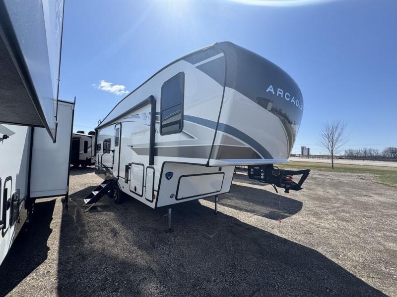 With any Arcadia Super Lite fifth wheel by Keystone, you will enjoy easy-to-tow lengths, unmatched storage, and oversized windows to let the outdoor views in. The structural I-beam frame will provide a strong foundation to your RV, and the Curt Performance Package means you can enjoy hassle-free towing. You will be able to camp year around thanks to the Peak Weather Package that includes a heated and enclosed underbelly, a 35K BTU furnace, and Keystone's exclusive HyperDeck floor that adds an additional layer of insulation to your floor. The interior will make you feel at home with residential hardware, seamless pressed countertops, black roller shades, and ample storage space. Sometimes the best things come in smaller packages; choose a Arcadia Super Lite today!