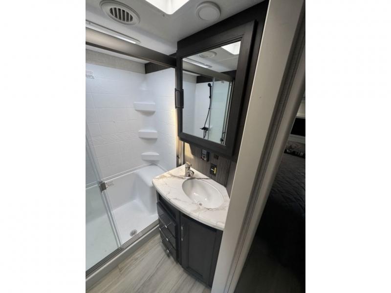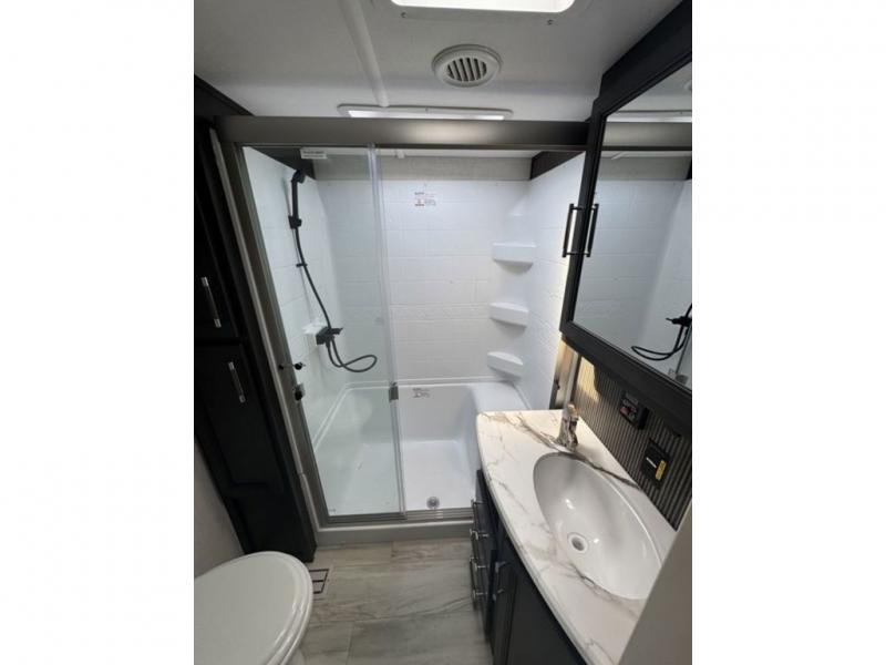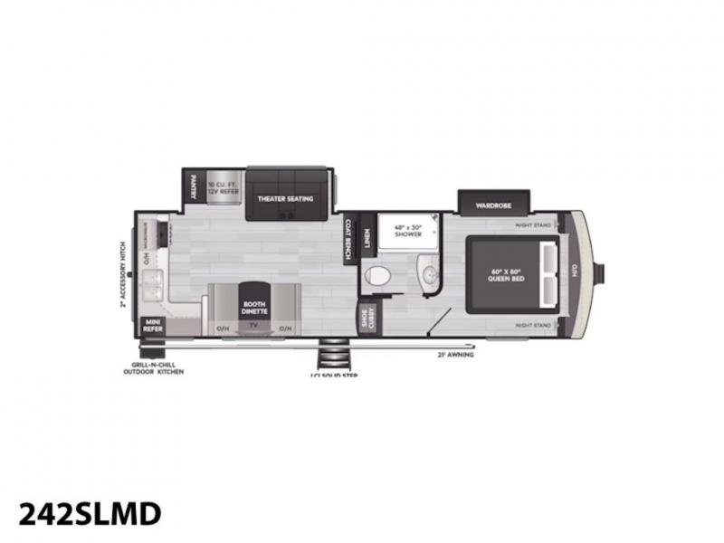 This rear kitchen fifth wheel is packed with features to make each trip memorable! Once you've arrived at the campground and set up the 21' electric awning, you can start lunch on the Grill-N-Chill outdoor kitchen before heading inside. If the weather isn't cooperating, you'll find a 21" Furrion range and microwave oven in the rear kitchen to whip up a meal. There is also a pantry and 10 cu. ft. 12V "Solar Friendly" refrigerator for food storage. The theater seating will provide a place for you to relax in the evenings, and the full bath with a spacious shower means you can clean up before bed. Speaking of bedtime, the front private bedroom includes a queen bed for a great night's rest. There are also dual nightstands and a wardrobe slide to keep your space tidy!