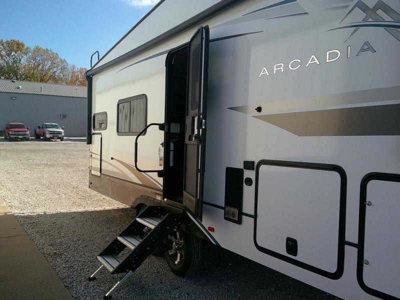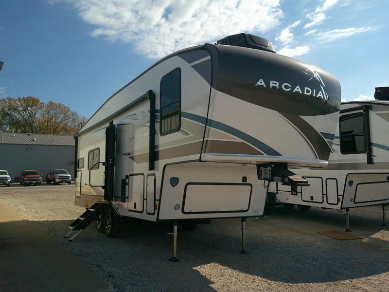 With any Arcadia Super Lite fifth wheel by Keystone, you will enjoy easy-to-tow lengths, unmatched storage, and oversized windows to let the outdoor views in. The structural I-beam frame will provide a strong foundation to your RV, and the Curt Performance Package means you can enjoy hassle-free towing. You will be able to camp year around thanks to the Peak Weather Package that includes a heated and enclosed underbelly, a 35K BTU furnace, and Keystone's exclusive HyperDeck floor that adds an additional layer of insulation to your floor. The interior will make you feel at home with residential hardware, seamless pressed countertops, black roller shades, and ample storage space. Sometimes the best things come in smaller packages; choose a Arcadia Super Lite today!