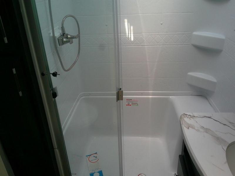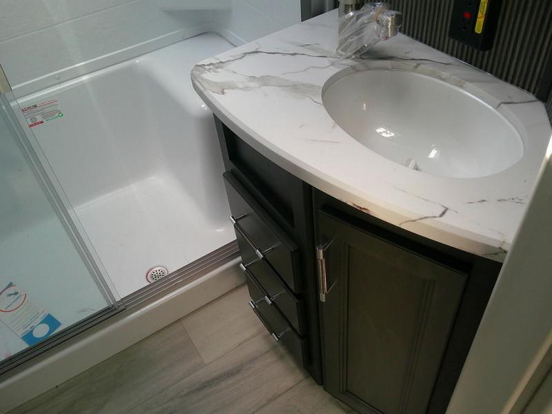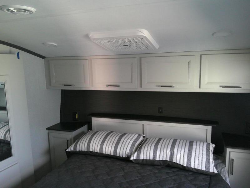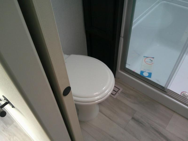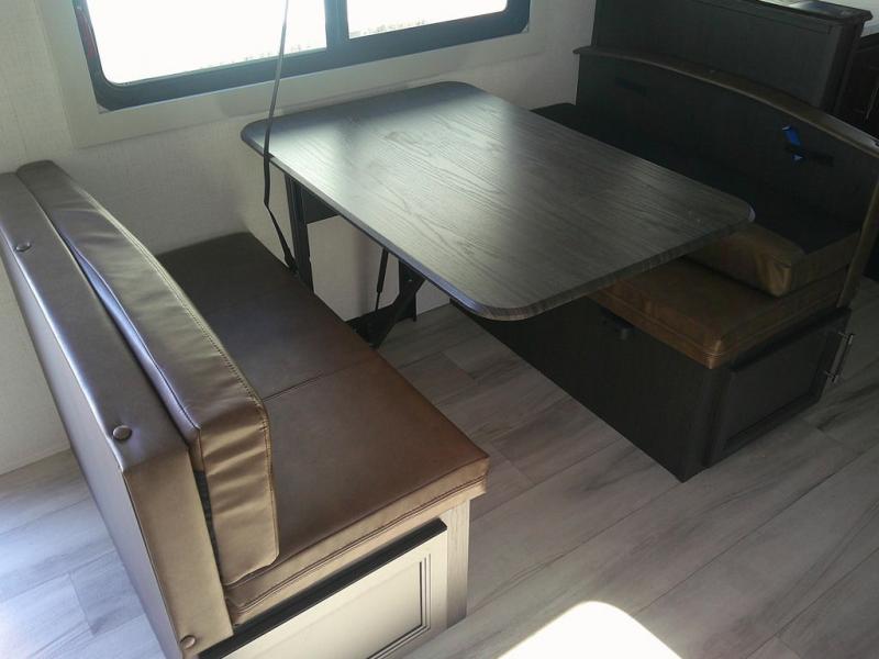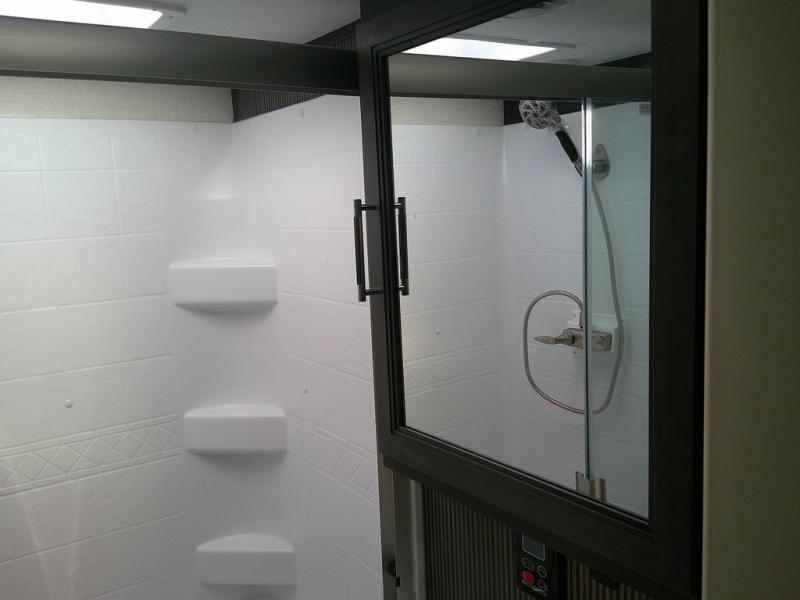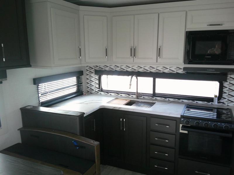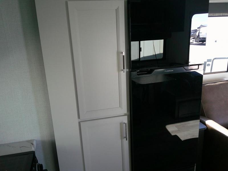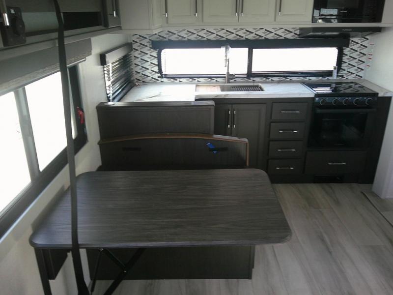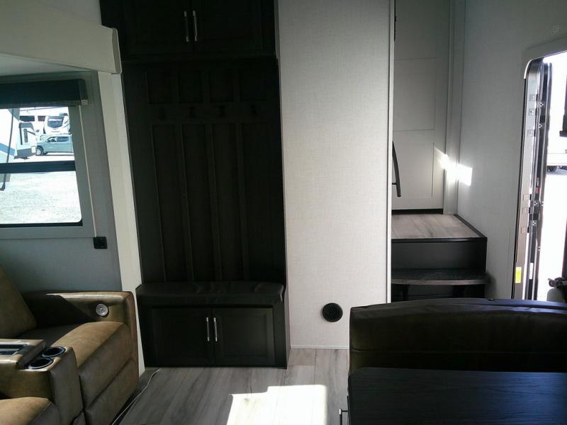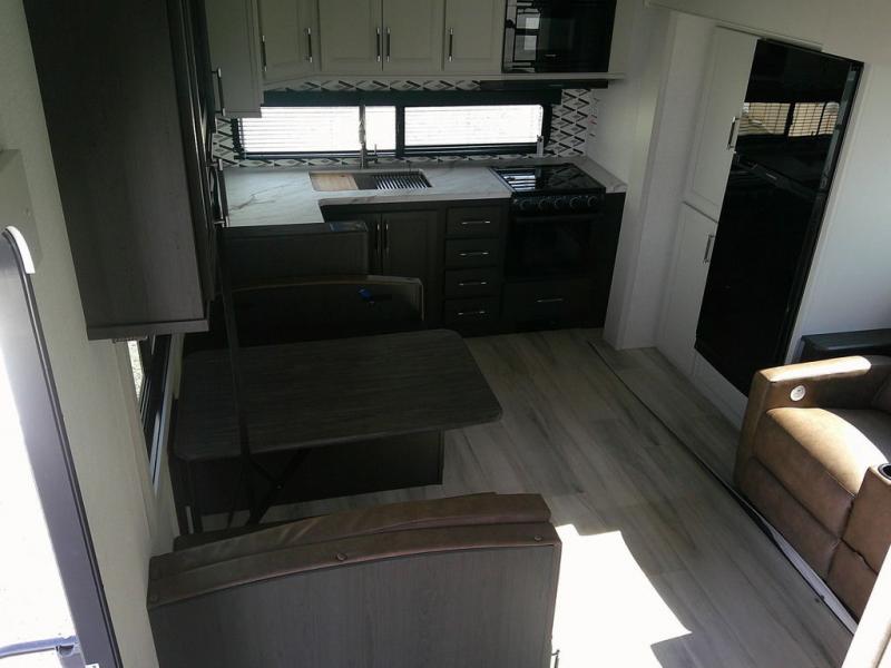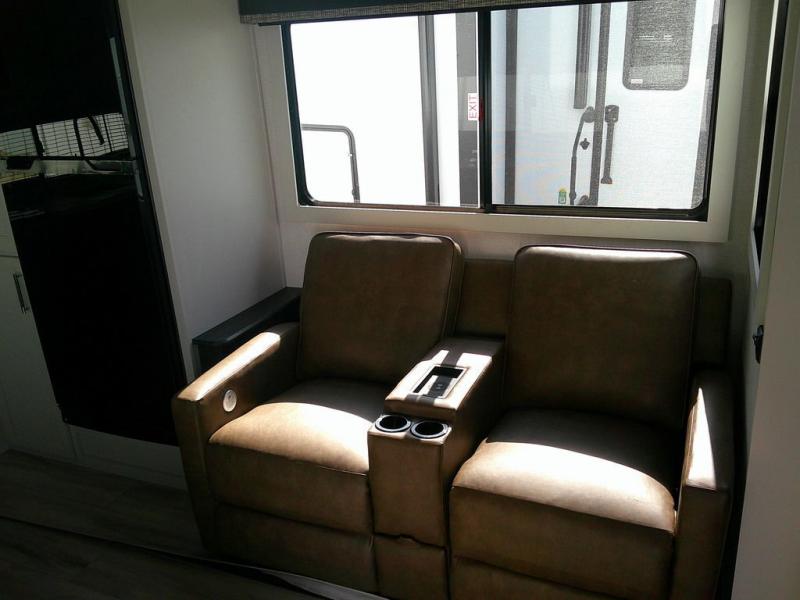 This rear kitchen fifth wheel is packed with features to make each trip memorable! Once you've arrived at the campground and set up the 21' electric awning, you can start lunch on the Grill-N-Chill outdoor kitchen before heading inside. If the weather isn't cooperating, you'll find a 21" Furrion range and microwave oven in the rear kitchen to whip up a meal. There is also a pantry and 10 cu. ft. 12V "Solar Friendly" refrigerator for food storage. The theater seating will provide a place for you to relax in the evenings, and the full bath with a spacious shower means you can clean up before bed. Speaking of bedtime, the front private bedroom includes a queen bed for a great night's rest. There are also dual nightstands and a wardrobe slide to keep your space tidy!