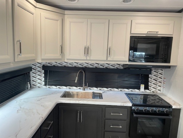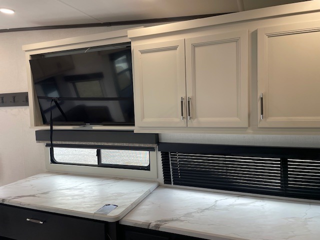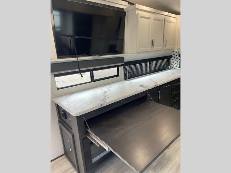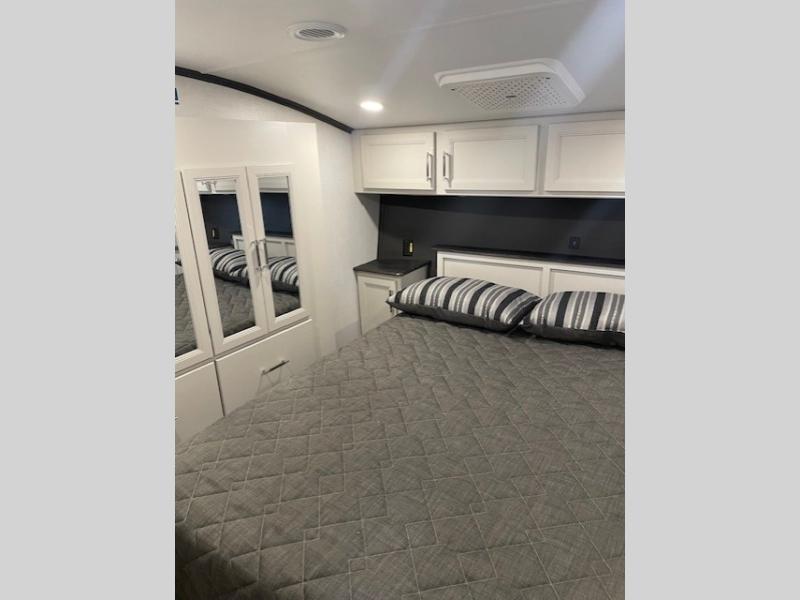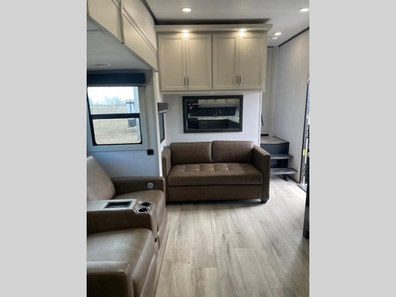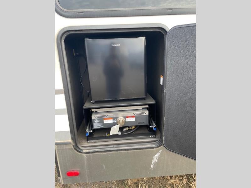 You're sure to love every minute spent in this rear kitchen fifth wheel! There is generous counter space to prep your best meals plus a pull-out dinette table where you can dine together. Additional seating space can be found on the theater seating and hide-a-bed sofa slide out. There is even a fireplace to make this space more cozy. If you enjoy spending time outdoors, there is a Grill-N-Chill outdoor kitchen, 19' power awning, and LCI solid steps. When it's time to call it a night, the queen bed in the private bedroom is sure to be calling your name!