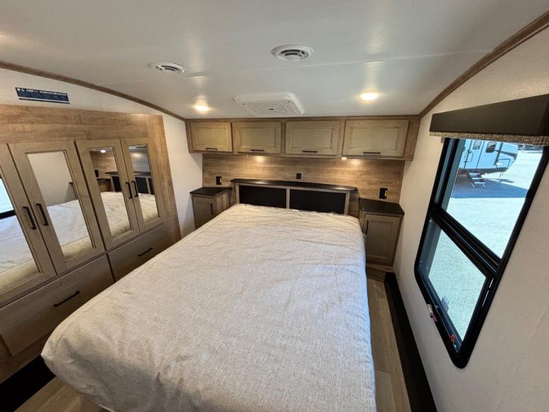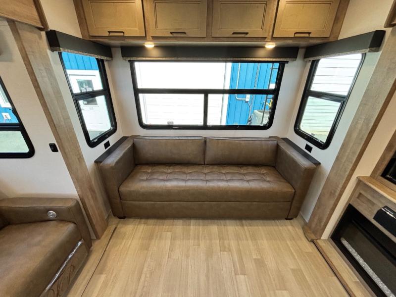 Make each camping trip complete with this fifth wheel in tow! The chef of your group will love making meals each day in the fully equipped kitchen that includes a kitchen island, a hutch, plus a pantry for food storage. The booth dinette will provide a place to dine each day, and the theater seating is right across from the TV with storage behind and a fireplace for easy viewing. And if you're not needing additional sleeping space you can switch out the booth dinette for the optional free-standing dinette! If you have guests, they can sleep on the rear XL sofa sleeper each night that extends to king-size, while you take the front private bedroom. Here, you'll find a queen bed, a wardrobe slide out, plus dual nightstands for your things.