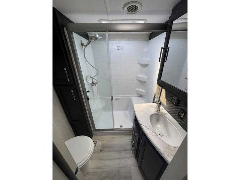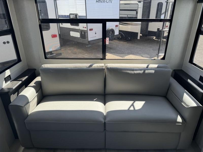 Make each camping trip complete with this fifth wheel in tow! The chef of your group will love making meals each day in the fully equipped kitchen that includes a kitchen island, a hutch, plus a pantry for food storage. The booth dinette will provide a place to dine each day, and the theater seating is right across from the TV with storage behind and a fireplace for easy viewing. And if you're not needing additional sleeping space you can switch out the booth dinette for the optional free-standing dinette! If you have guests, they can sleep on the rear XL sofa sleeper each night that extends to king-size, while you take the front private bedroom. Here, you'll find a queen bed, a wardrobe slide out, plus dual nightstands for your things.