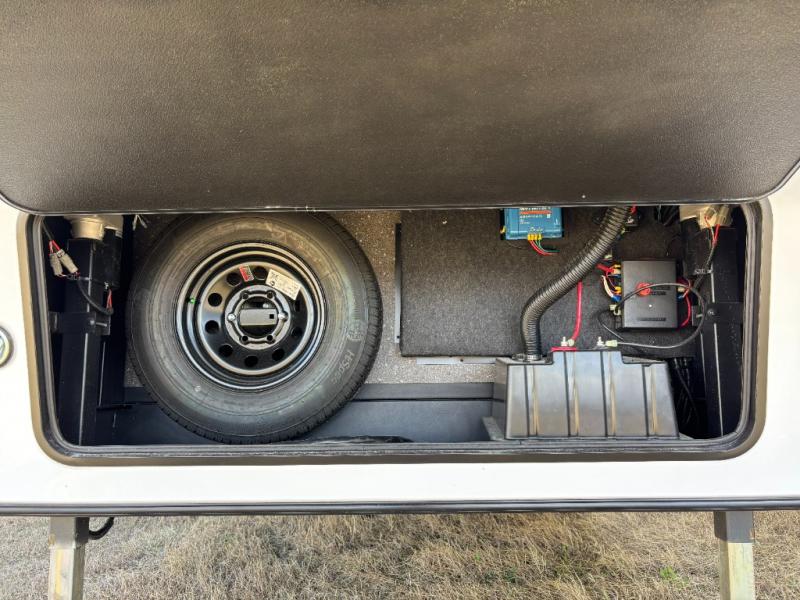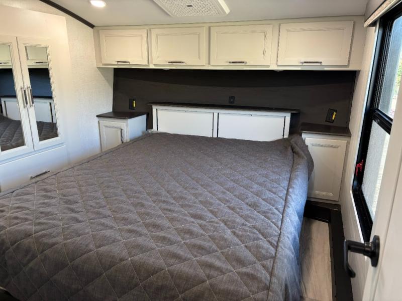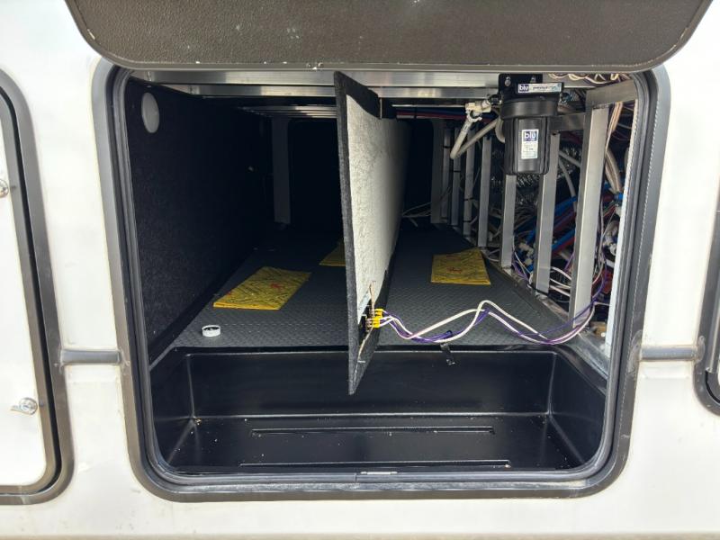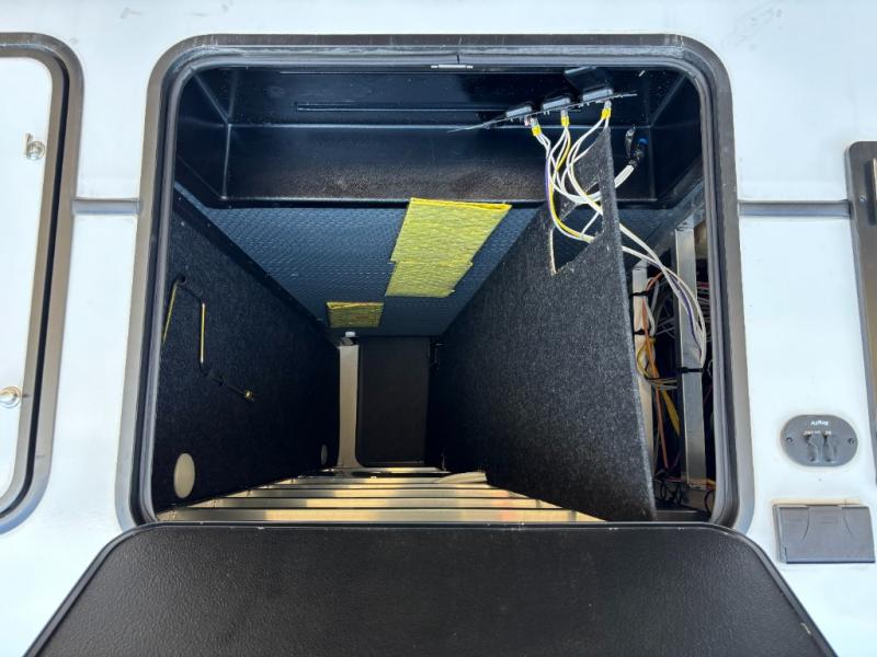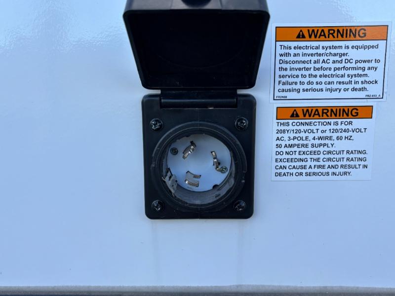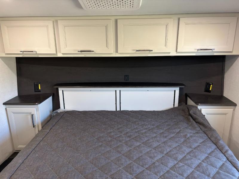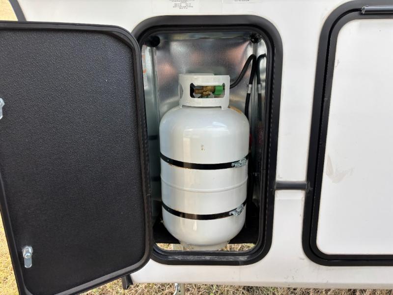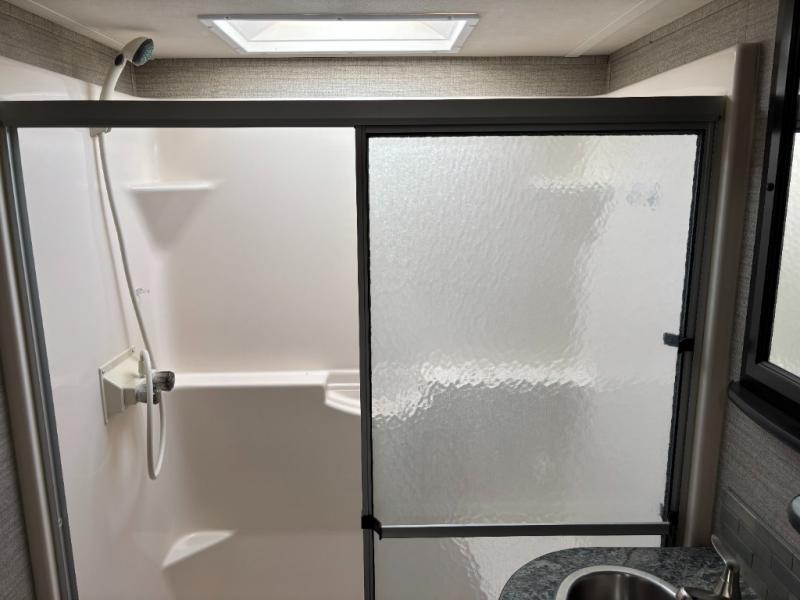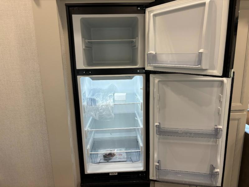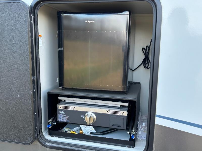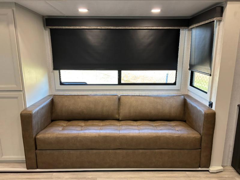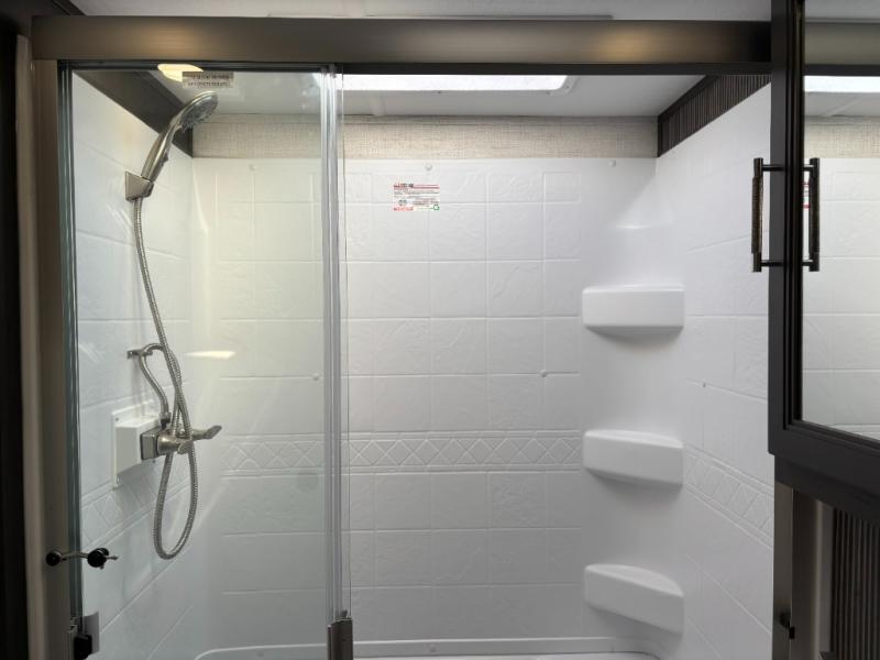 Camping is made easy in this fifth wheel! Once you arrive at the campground, you can enter in through the LCI solid entry steps and start cooking a delicious meal in the middle kitchen with the 21" Furrion range with Piezo ignition,10 cu. ft. 12V "Solar Friendly" refrigerator, and 0.9 cu. ft. microwave to pop a bag of popcorn for movie night. The rear living area offers a more at-home feel with a rear entertainment center with a fireplace, theater seating, and plenty of space to move about thanks to the opposing slide outs. There is also a free standing dinette to play card games and enjoy meals and an XL sofa sleeper that extends to a king-size sleeping space. The full bath includes a 48" x 30" shower with a glass door and a skylight for more standing space, and the front private bedroom includes a queen bed for a great night's rest. You'll also find a wardrobe slide here and an end table with an outlet and a USB port to charge your electronics.
