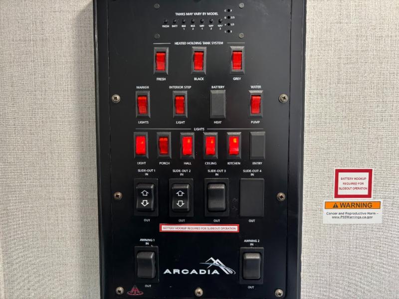 With any Arcadia Super Lite fifth wheel by Keystone, you will enjoy easy-to-tow lengths, unmatched storage, and oversized windows to let the outdoor views in. The structural I-beam frame will provide a strong foundation to your RV, and the Curt Performance Package means you can enjoy hassle-free towing. You will be able to camp year around thanks to the Peak Weather Package that includes a heated and enclosed underbelly, a 35K BTU furnace, and Keystone's exclusive HyperDeck floor that adds an additional layer of insulation to your floor. The interior will make you feel at home with residential hardware, seamless pressed countertops, residential Roman shades throughout, and ample storage space. Sometimes the best things come in smaller packages; choose a Arcadia Super Lite today!
