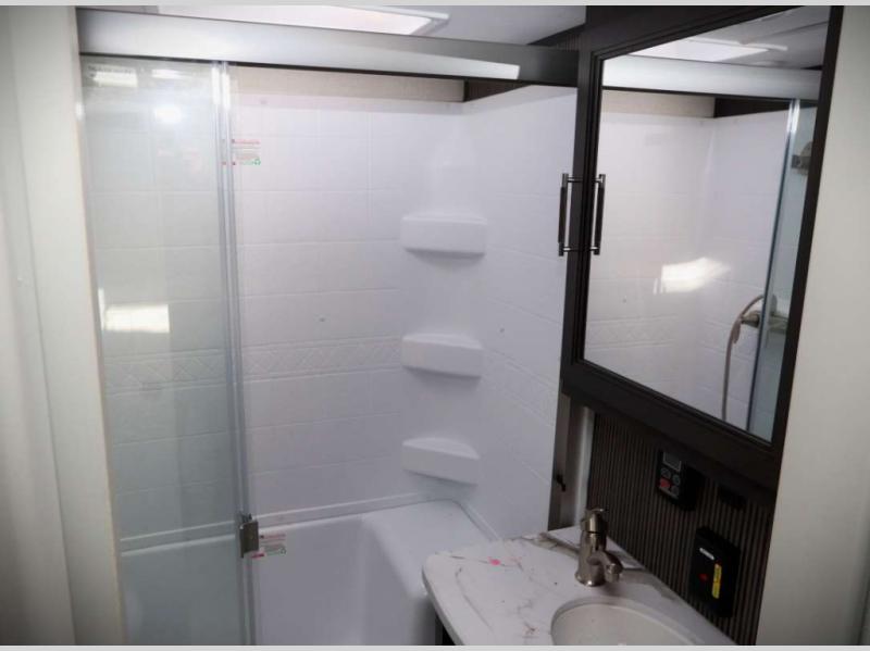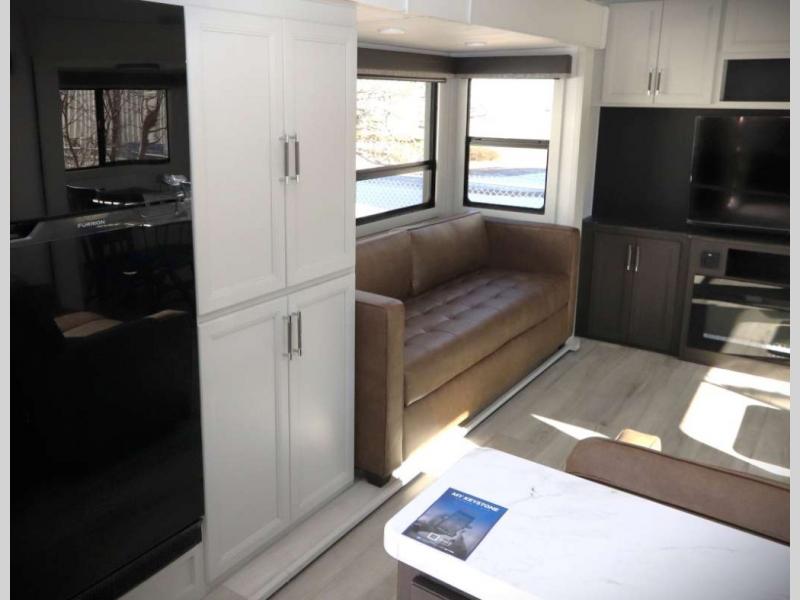 Camping is made easy in this fifth wheel! Once you arrive at the campground, you can enter in through the LCI solid entry steps and start cooking a delicious meal in the middle kitchen with the 21" Furrion range with Piezo ignition,10 cu. ft. 12V "Solar Friendly" refrigerator, and 0.9 cu. ft. microwave to pop a bag of popcorn for movie night. The rear living area offers a more at-home feel with a rear entertainment center with a fireplace, theater seating, and plenty of space to move about thanks to the opposing slide outs. There is also a free standing dinette to play card games and enjoy meals and an XL sofa sleeper that extends to a king-size sleeping space. The full bath includes a 48" x 30" shower with a glass door and a skylight for more standing space, and the front private bedroom includes a queen bed for a great night's rest. You'll also find a wardrobe slide here and an end table with an outlet and a USB port to charge your electronics.