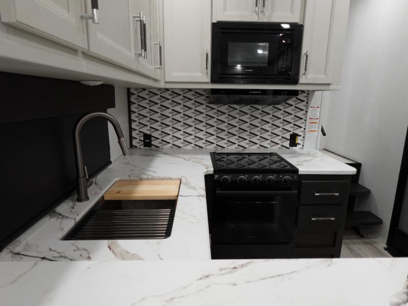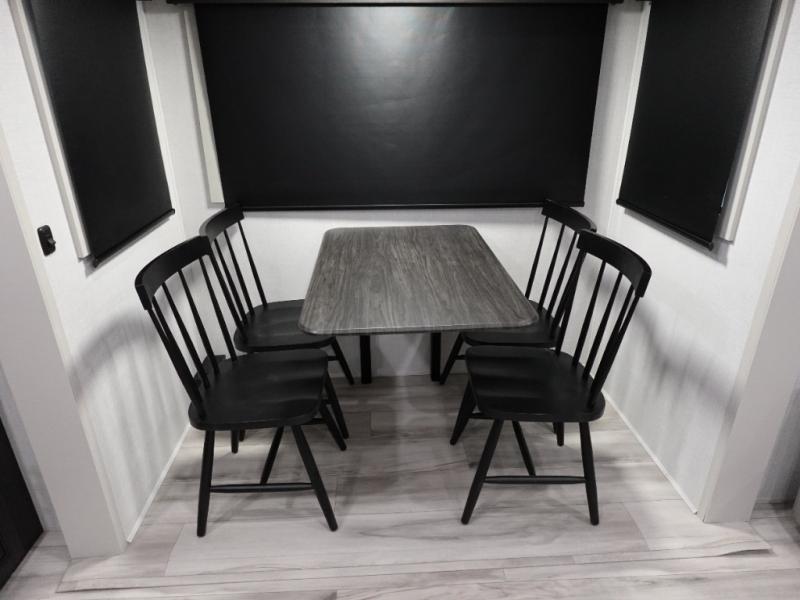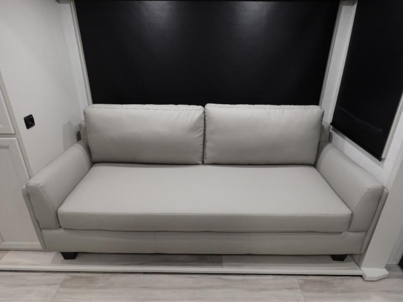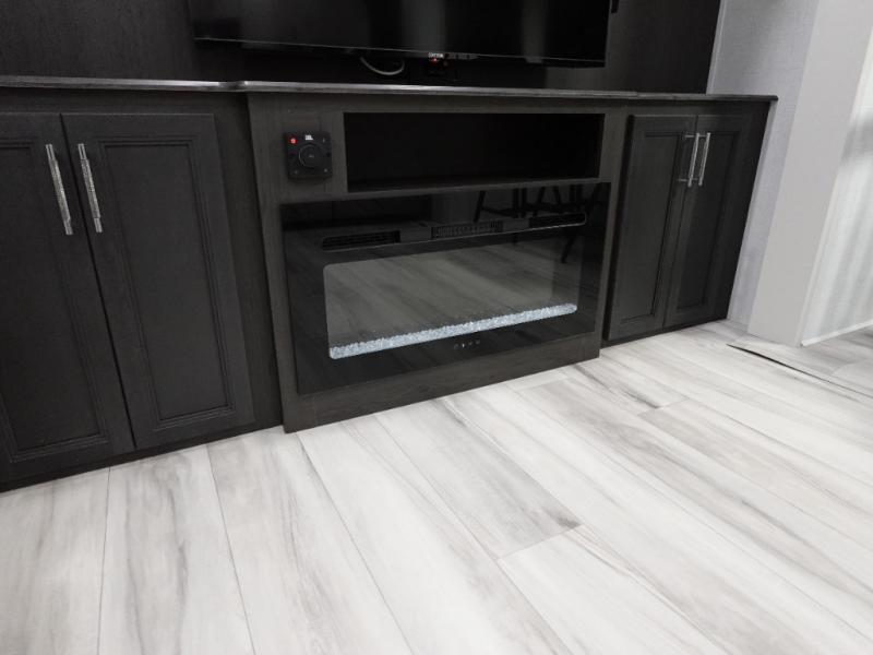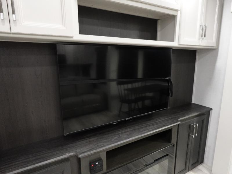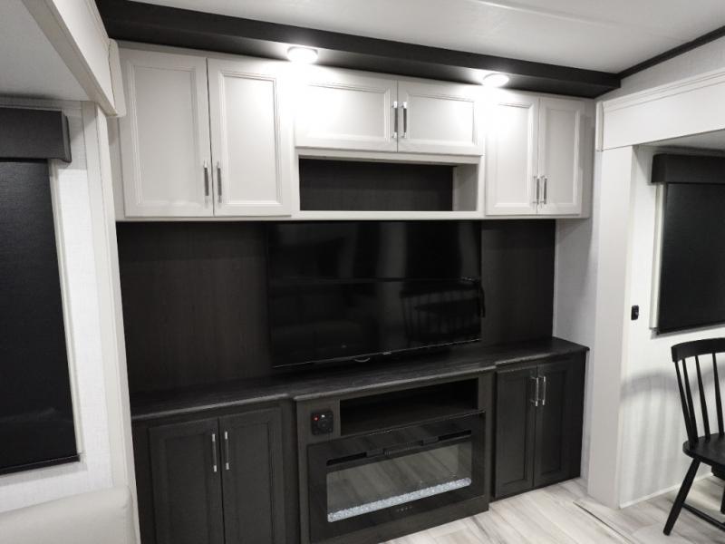 Camping is made easy in this fifth wheel! Once you arrive at the campground, you can enter in through the LCI solid entry steps and start cooking a delicious meal in the middle kitchen with the 21" Furrion range with Piezo ignition,10 cu. ft. 12V "Solar Friendly" refrigerator, and 0.9 cu. ft. microwave to pop a bag of popcorn for movie night. The rear living area offers a more at-home feel with a rear entertainment center with a fireplace, theater seating, and plenty of space to move about thanks to the opposing slide outs. There is also a free standing dinette to play card games and enjoy meals and an XL sofa sleeper that extends to a king-size sleeping space. The full bath includes a 48" x 30" shower with a glass door and a skylight for more standing space, and the front private bedroom includes a queen bed for a great night's rest. You'll also find a wardrobe slide here and an end table with an outlet and a USB port to charge your electronics.