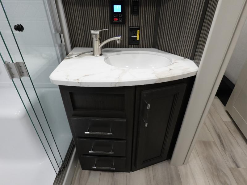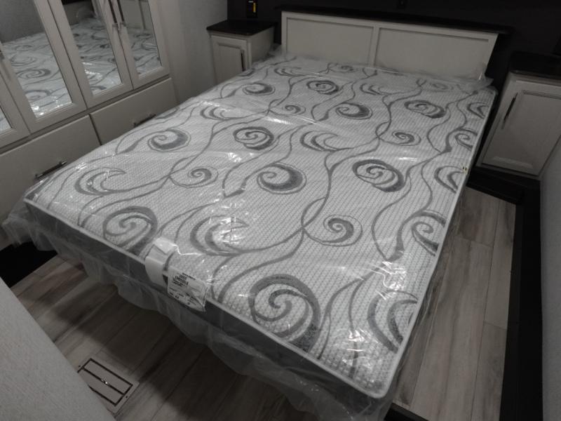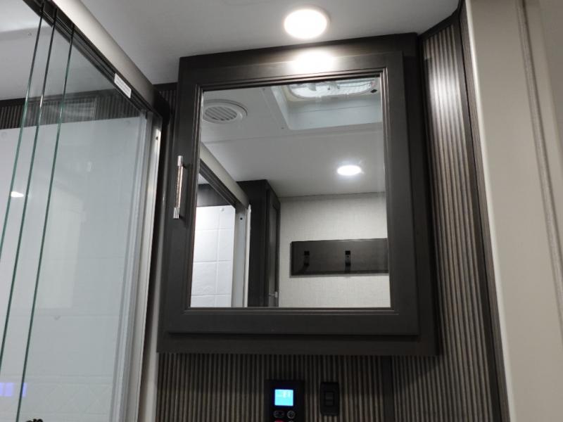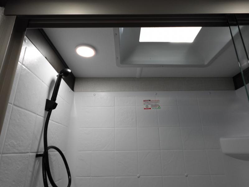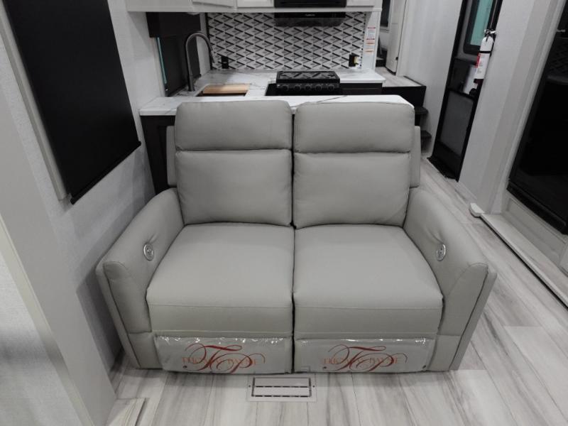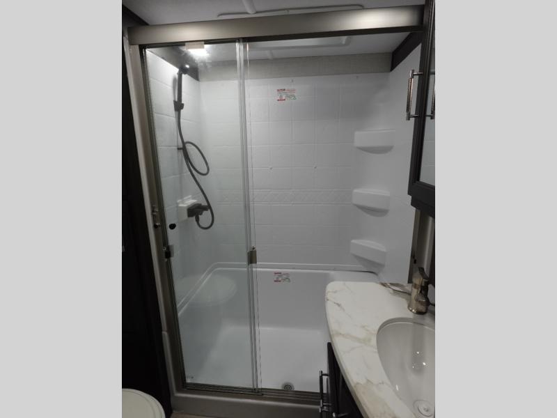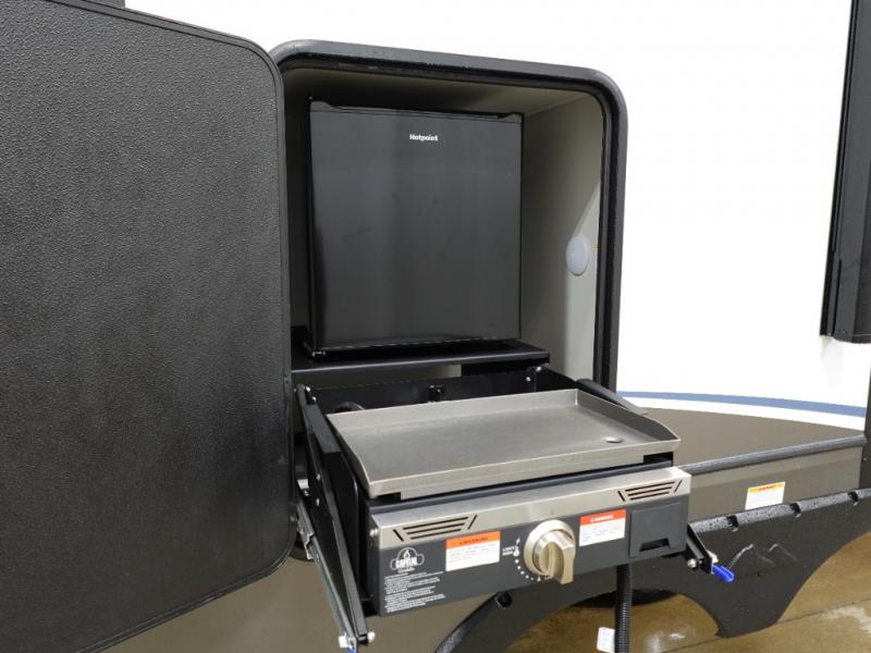 Camping is made easy in this fifth wheel! Once you arrive at the campground, you can enter in through the LCI solid entry steps and start cooking a delicious meal in the middle kitchen with the 21" Furrion range with Piezo ignition,10 cu. ft. 12V "Solar Friendly" refrigerator, and 0.9 cu. ft. microwave to pop a bag of popcorn for movie night. The rear living area offers a more at-home feel with a rear entertainment center with a fireplace, theater seating, and plenty of space to move about thanks to the opposing slide outs. There is also a free standing dinette to play card games and enjoy meals and an XL sofa sleeper that extends to a king-size sleeping space. The full bath includes a 48" x 30" shower with a glass door and a skylight for more standing space, and the front private bedroom includes a queen bed for a great night's rest. You'll also find a wardrobe slide here and an end table with an outlet and a USB port to charge your electronics.