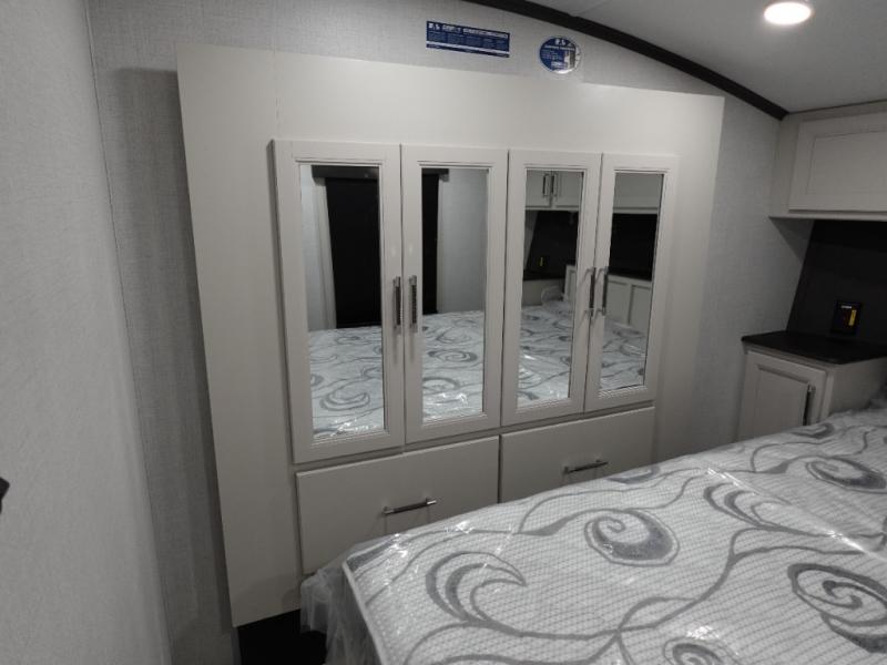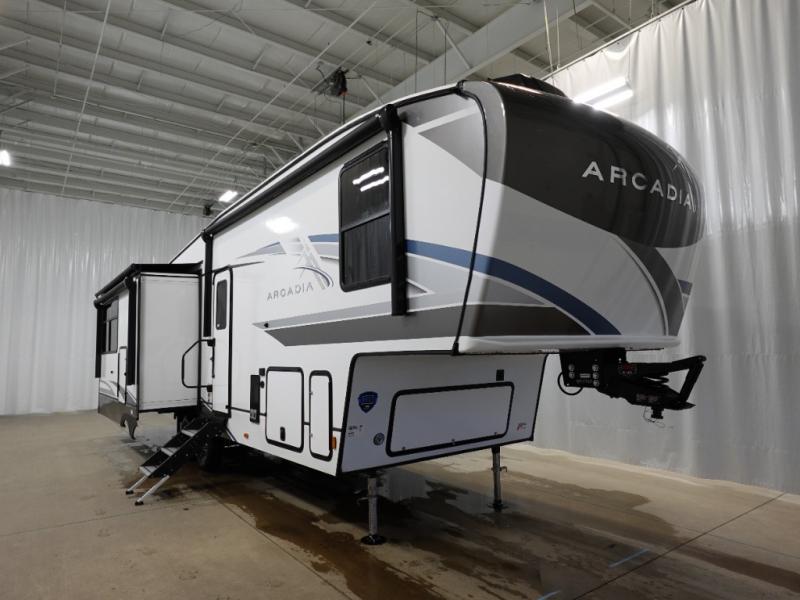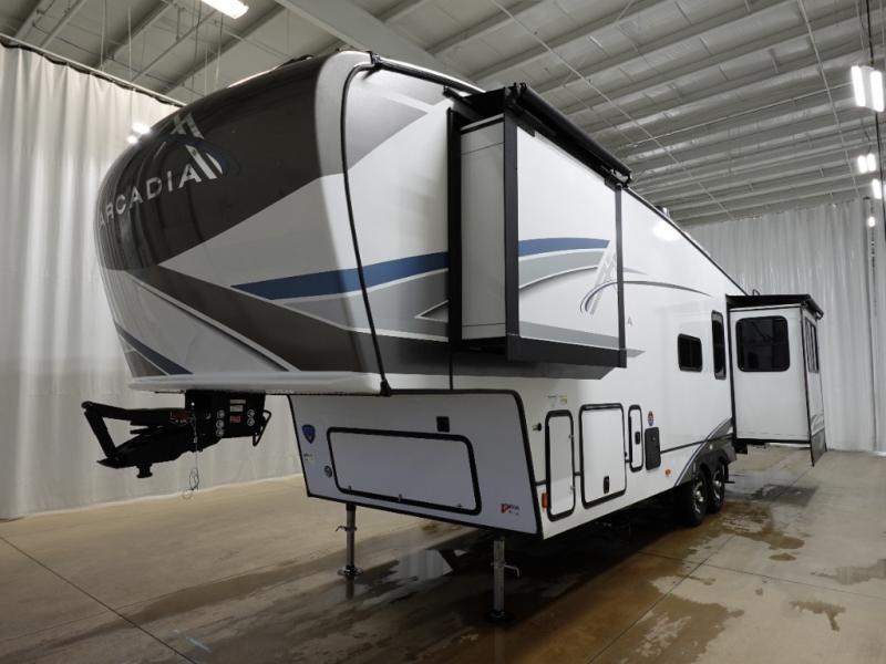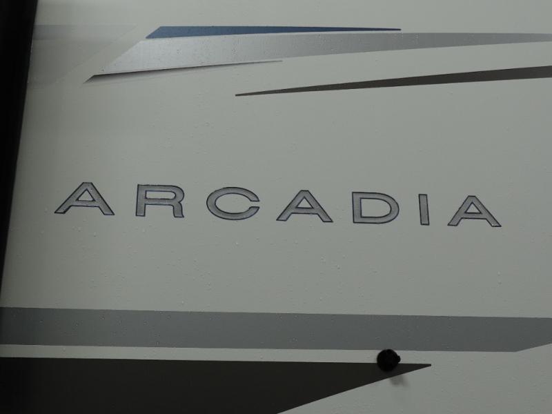With any Arcadia Super Lite fifth wheel by Keystone, you will enjoy easy-to-tow lengths, unmatched storage, and oversized windows to let the outdoor views in. The structural I-beam frame will provide a strong foundation to your RV, and the Curt Performance Package means you can enjoy hassle-free towing. You will be able to camp year around thanks to the Peak Weather Package that includes a heated and enclosed underbelly, a 35K BTU furnace, and Keystone's exclusive HyperDeck floor that adds an additional layer of insulation to your floor. The interior will make you feel at home with residential hardware, seamless pressed countertops, black roller shades, and ample storage space. Sometimes the best things come in smaller packages; choose a Arcadia Super Lite today!