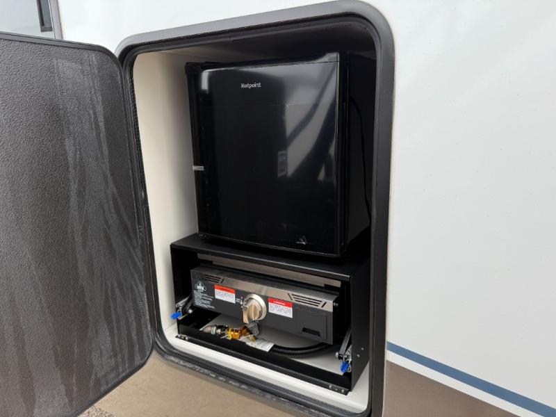 Camping is made easy in this fifth wheel! Once you arrive at the campground, you can enter in through the LCI solid entry steps and start cooking a delicious meal in the middle kitchen with the 21" Furrion range with Piezo ignition,10 cu. ft. 12V "Solar Friendly" refrigerator, and 0.9 cu. ft. microwave to pop a bag of popcorn for movie night. The rear living area offers a more at-home feel with a rear entertainment center with a fireplace, theater seating, and plenty of space to move about thanks to the opposing slide outs. There is also a free standing dinette to play card games and enjoy meals and an XL sofa sleeper that extends to a king-size sleeping space. The full bath includes a 48" x 30" shower with a glass door and a skylight for more standing space, and the front private bedroom includes a queen bed for a great night's rest. You'll also find a wardrobe slide here and an end table with an outlet and a USB port to charge your electronics.