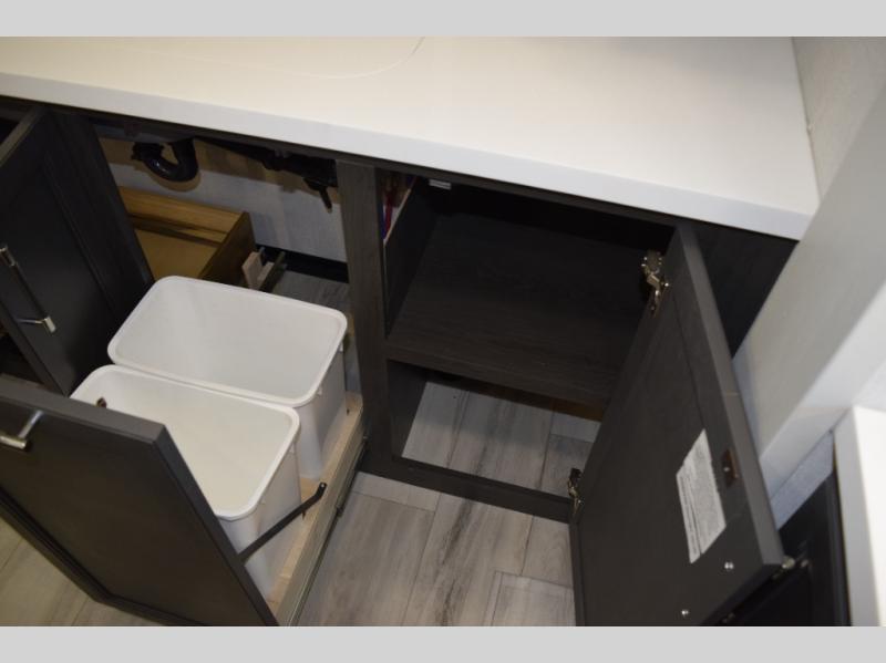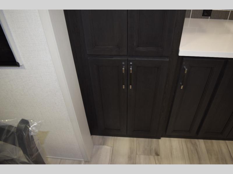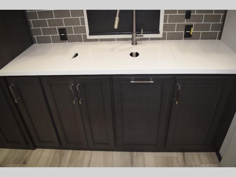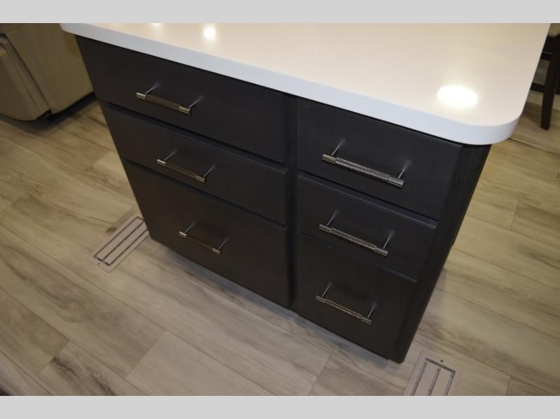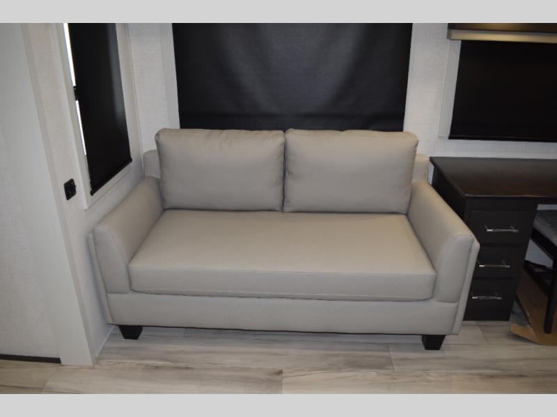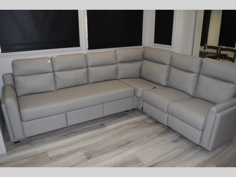 The rear kitchen is a chef's dream! You’ll have ample counter space with a gorgeous kitchen island, plus an 18 cu. ft. residential refrigerator and pantry for all your culinary needs. The free-standing dinette is a cozy spot for meals with loved ones, while the L-shaped sofa with recliners offers the ultimate relaxation after a long day of exploration. Need extra sleeping space? The sofa doubles as a hide-a-bed sleeper for your guests.
