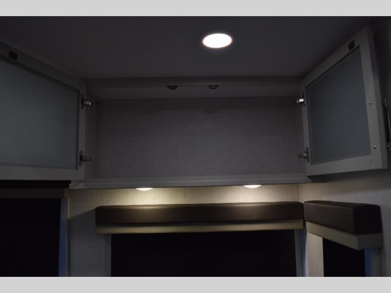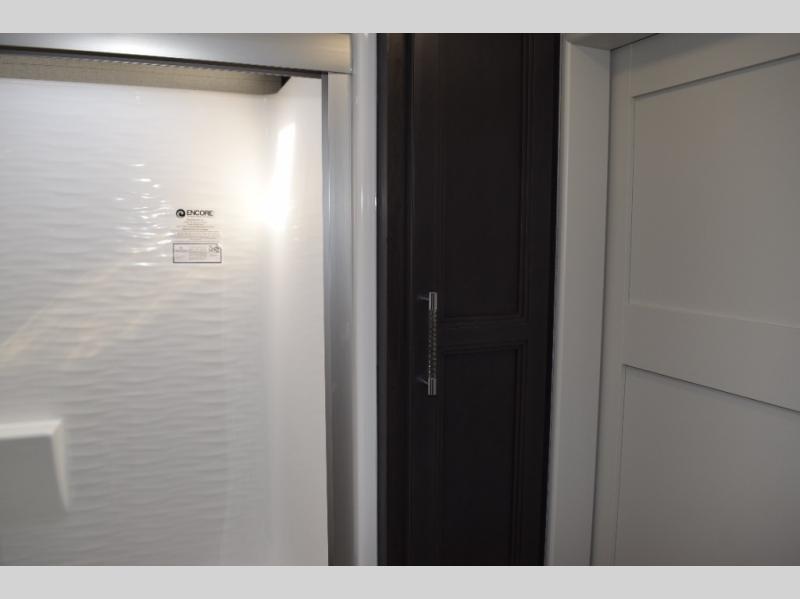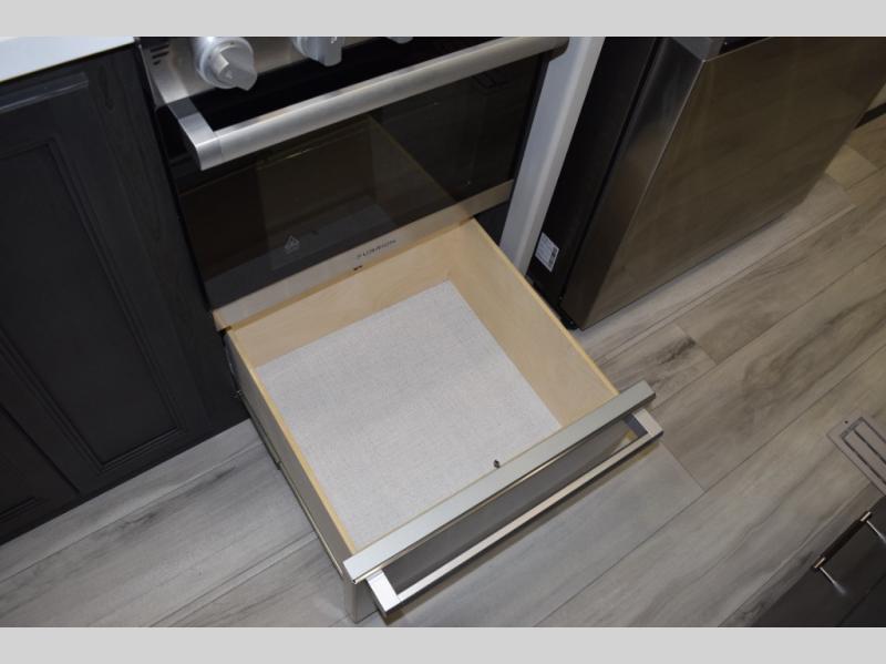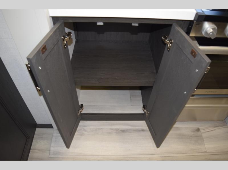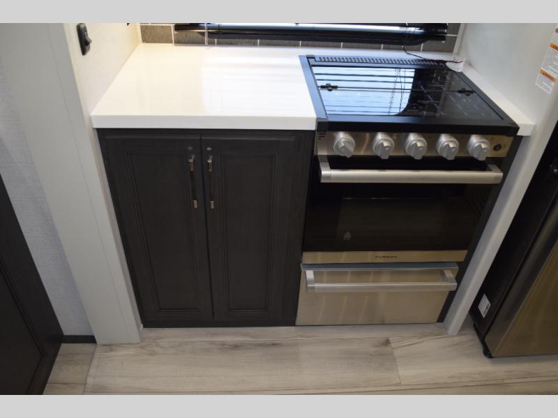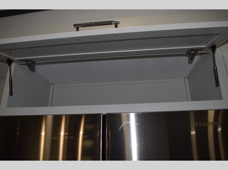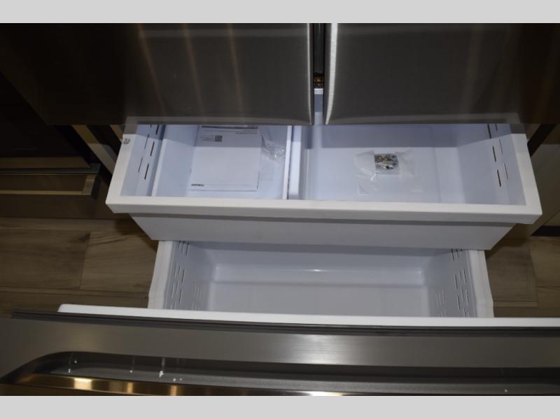 The rear kitchen is a chef's dream! You’ll have ample counter space with a gorgeous kitchen island, plus an 18 cu. ft. residential refrigerator and pantry for all your culinary needs. The free-standing dinette is a cozy spot for meals with loved ones, while the L-shaped sofa with recliners offers the ultimate relaxation after a long day of exploration. Need extra sleeping space? The sofa doubles as a hide-a-bed sleeper for your guests.