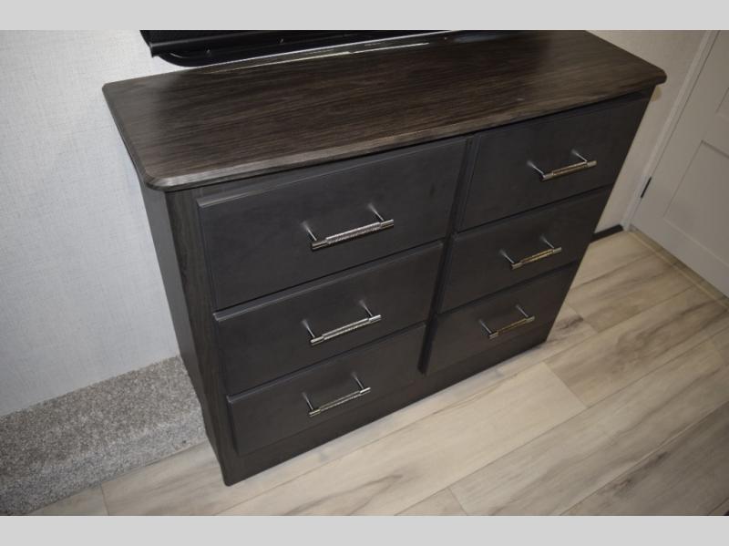 When it’s time to freshen up, the dual-entry bath comes with a roomy shower and a built-in seat for your comfort. Plus, the front master bedroom feels just like home, featuring a king bed slide-out and a spacious master closet. Need extra storage or laundry options? You’ve got it with a dresser and stackable washer and dryer prep!