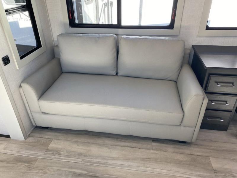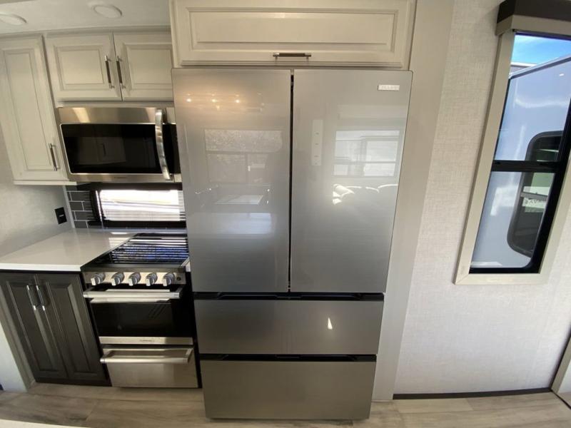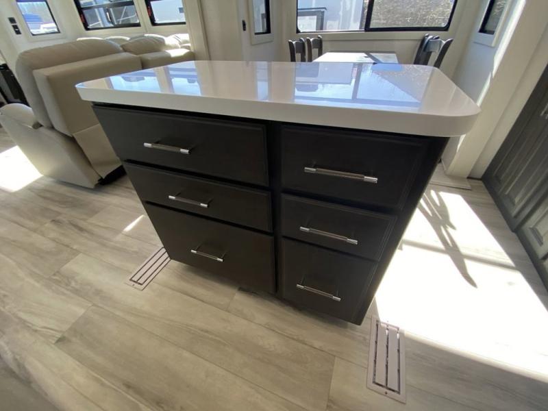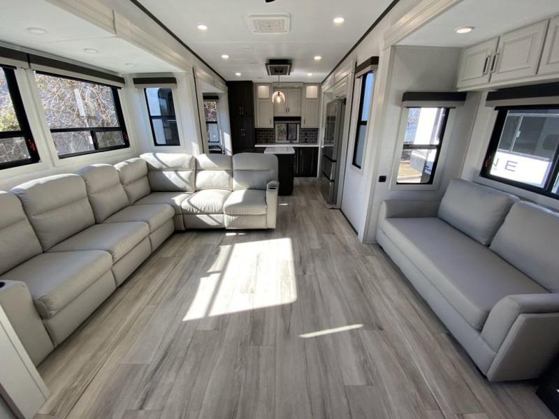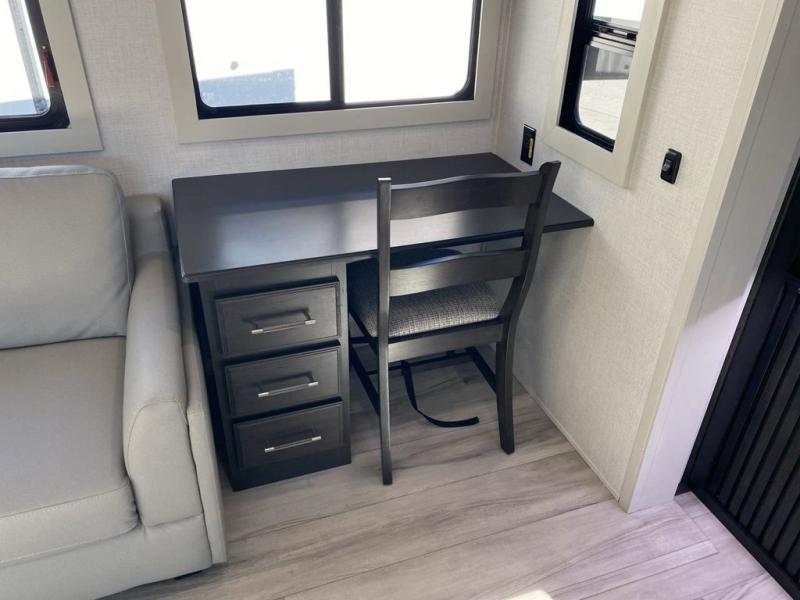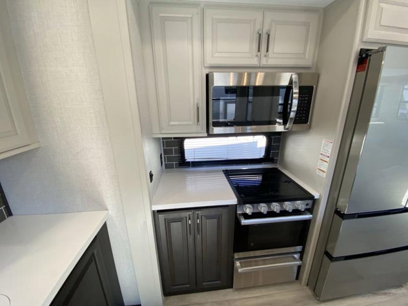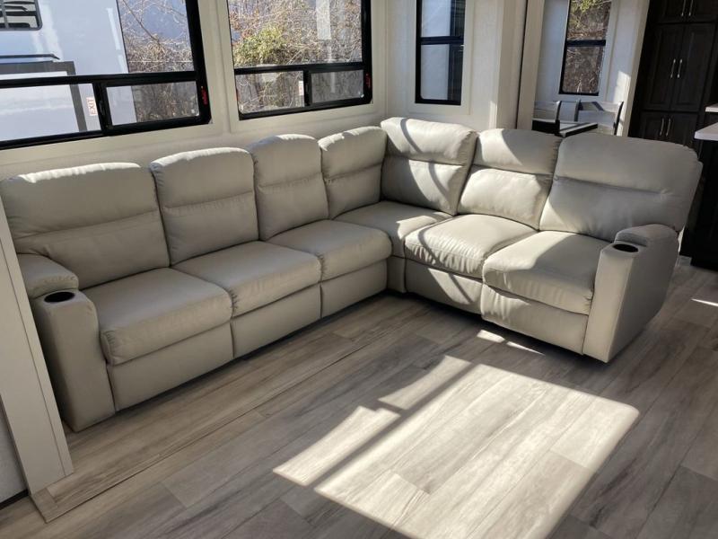 This rear kitchen fifth wheel makes extended stays or weekend trips to the lake enjoyable! The chef of your group will find plenty of counter space with the included kitchen island, plus there is a pantry and 18 cu. ft. residential refrigerator for food storage. A free-standing dinette provides a place to dine together, and the largest L-shaped sofa with recliners will be the perfect spot to relax with a movie. If you have guests, they could sleep here or on the hide-a-bed sofa sleeper. The dual entry bath includes a shower with a seat for added comfort, and the front master bedroom will feel just like home with its king bed slide out and master closet. There is also a dresser and stackable washer and dryer prep if you want to add those appliances!