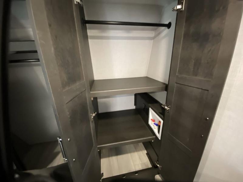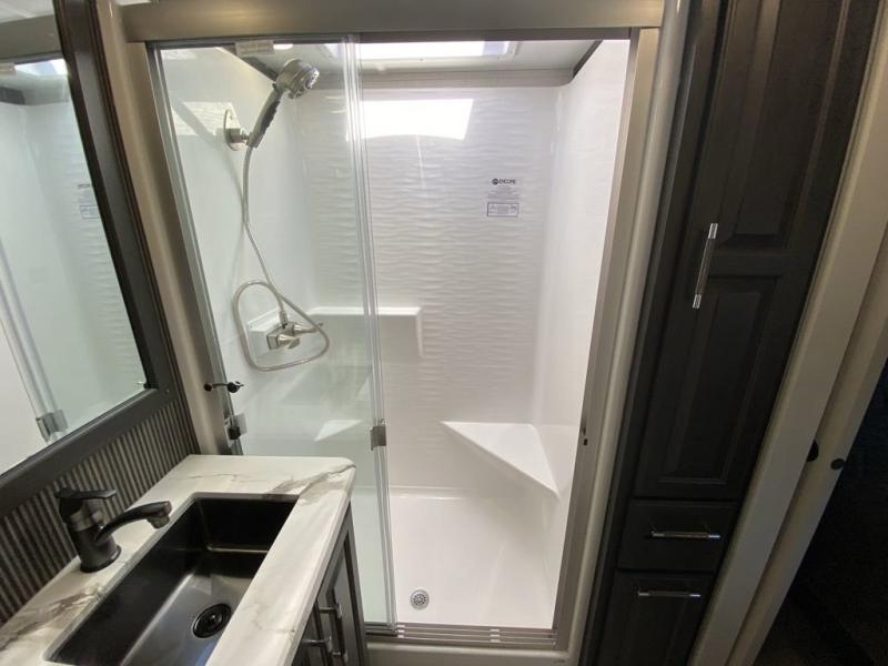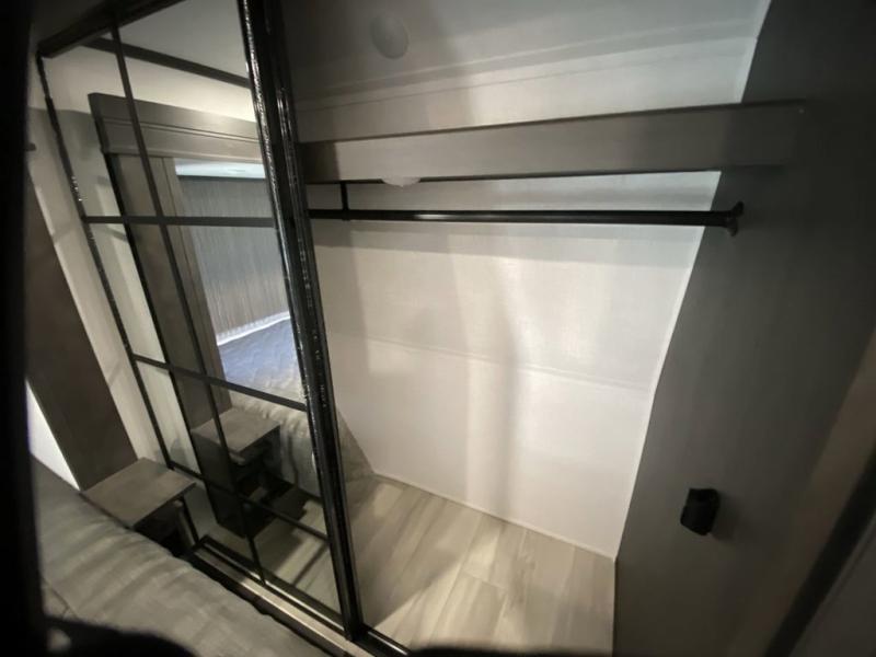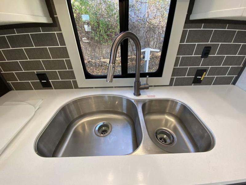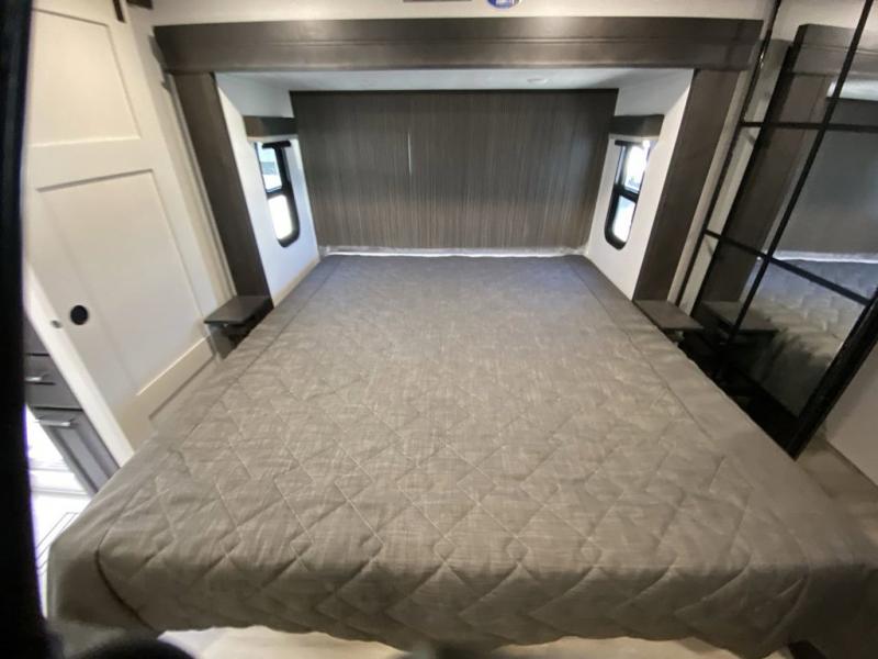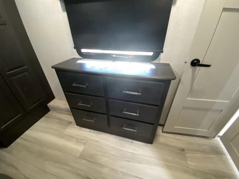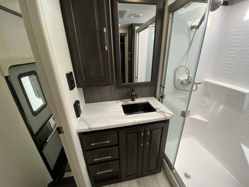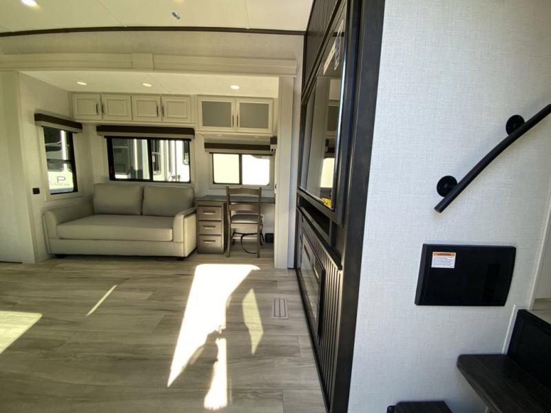 This rear kitchen fifth wheel makes extended stays or weekend trips to the lake enjoyable! The chef of your group will find plenty of counter space with the included kitchen island, plus there is a pantry and 18 cu. ft. residential refrigerator for food storage. A free-standing dinette provides a place to dine together, and the largest L-shaped sofa with recliners will be the perfect spot to relax with a movie. If you have guests, they could sleep here or on the hide-a-bed sofa sleeper. The dual entry bath includes a shower with a seat for added comfort, and the front master bedroom will feel just like home with its king bed slide out and master closet. There is also a dresser and stackable washer and dryer prep if you want to add those appliances!