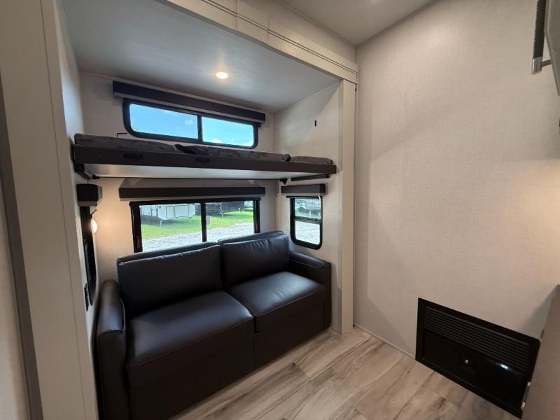 The middle bunkroom offers a versatile space for guests or kids with a flip-up bunk above a hide-a-bed sofa, a pull-out desk/table, and plenty of storage. Need extra sleeping room? The sleeper sofa in the living area and U-shaped dinette provide even more overnight accommodations!