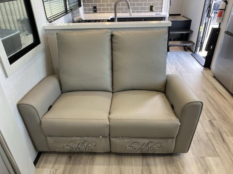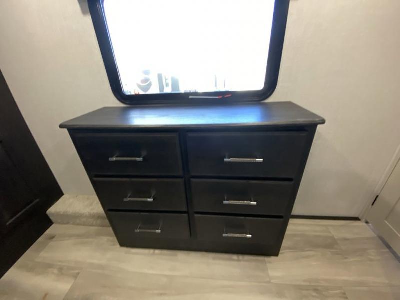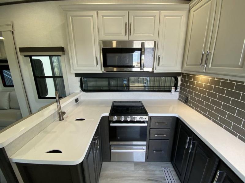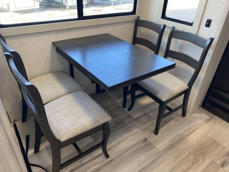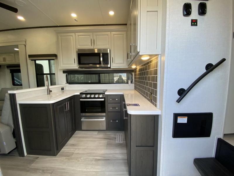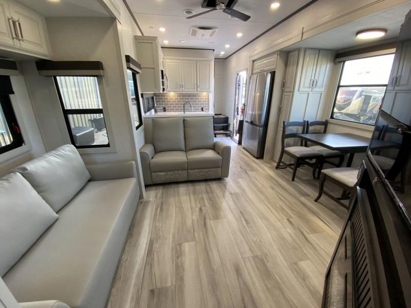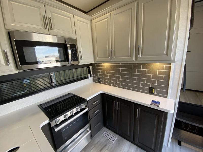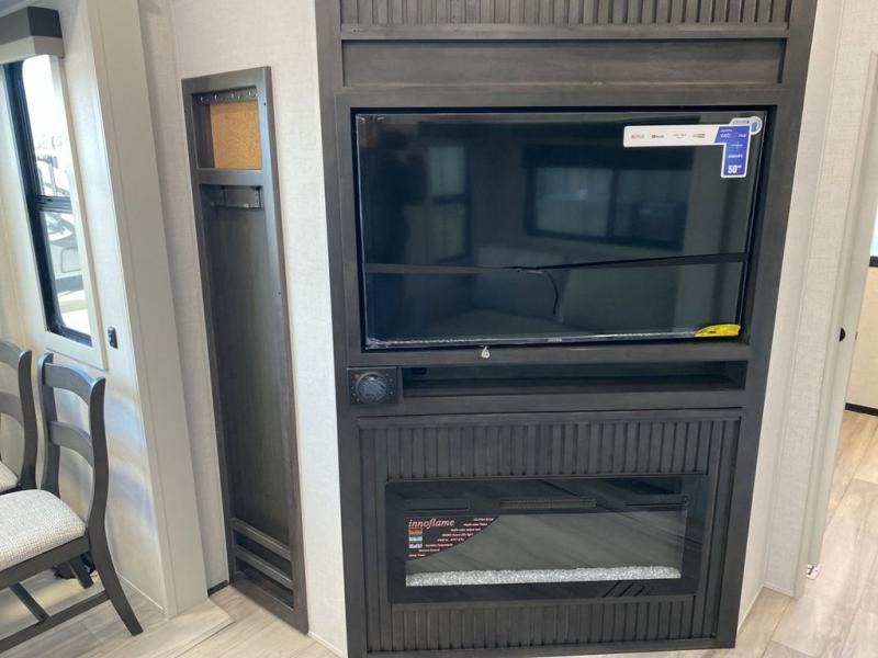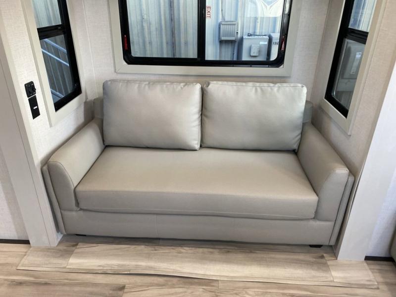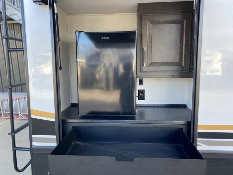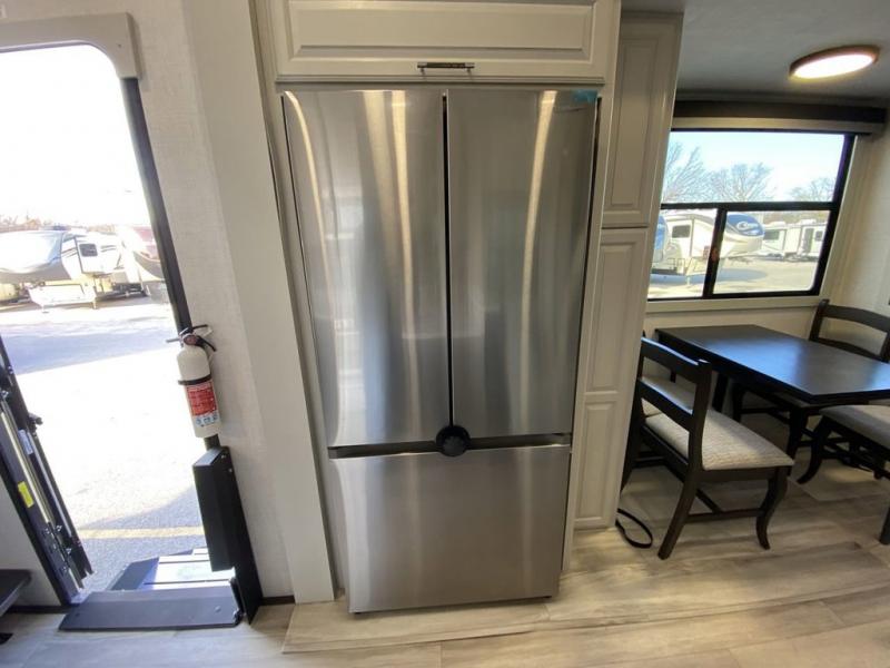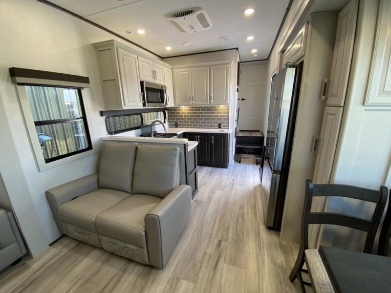 Are you looking for a spacious fifth wheel with space for you and your guests? Look no further than this four slide out unit with dual entry doors, a front master bedroom, and a rear bedroom/den with a loft! There is also a half bath here and a hide-a-bed sofa with storage underneath. You'll find the second hide-a-bed sofa in the living room, along with theater seating, a feature wall with a 50" TV, and a free-standing dinette with chairs where you can dine together. Furrion appliances in the kitchen let you create yummy meals each day, and there is a pantry and residential refrigerator to keep food stocked. Head to the front master bedroom where you can relax on the king bed slide out, store your clothes in the master closet, and easily use the dual entry bath. There is even stackable washer and dryer prep if you want the option to make laundry day easier!