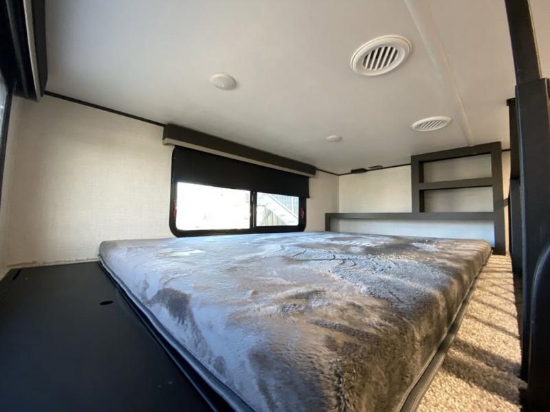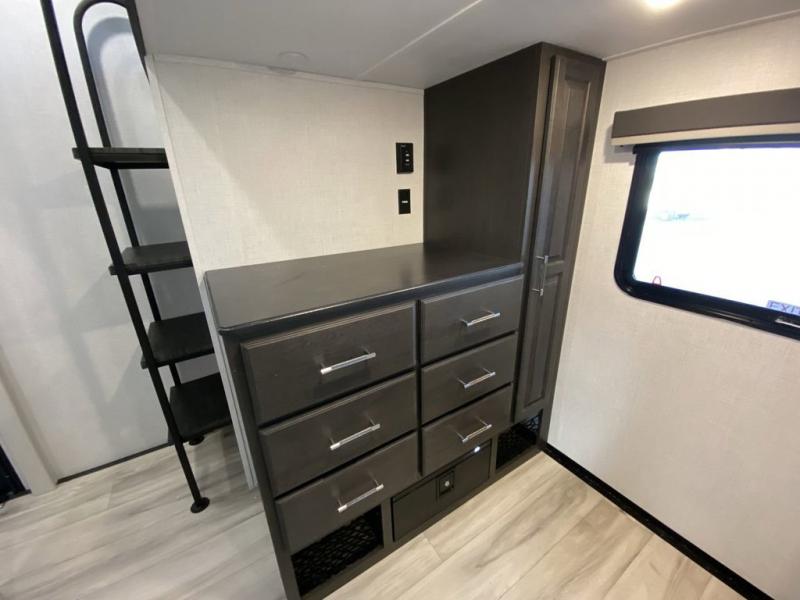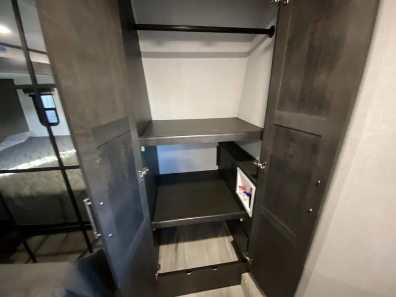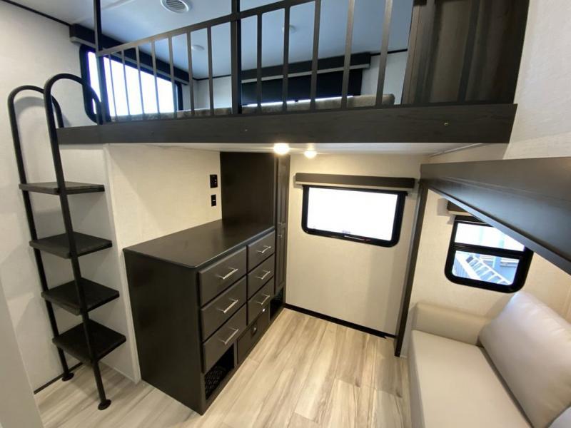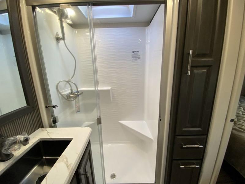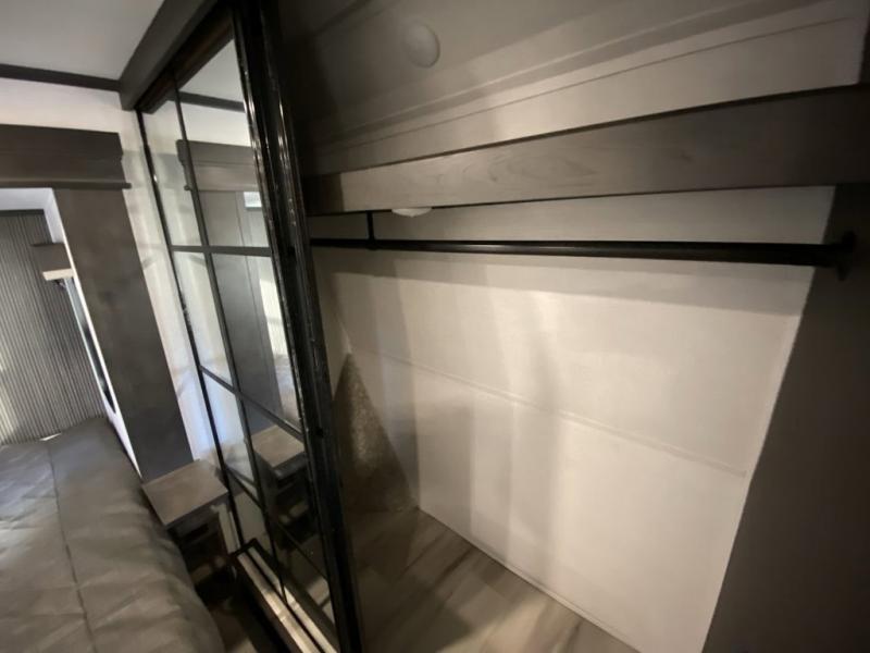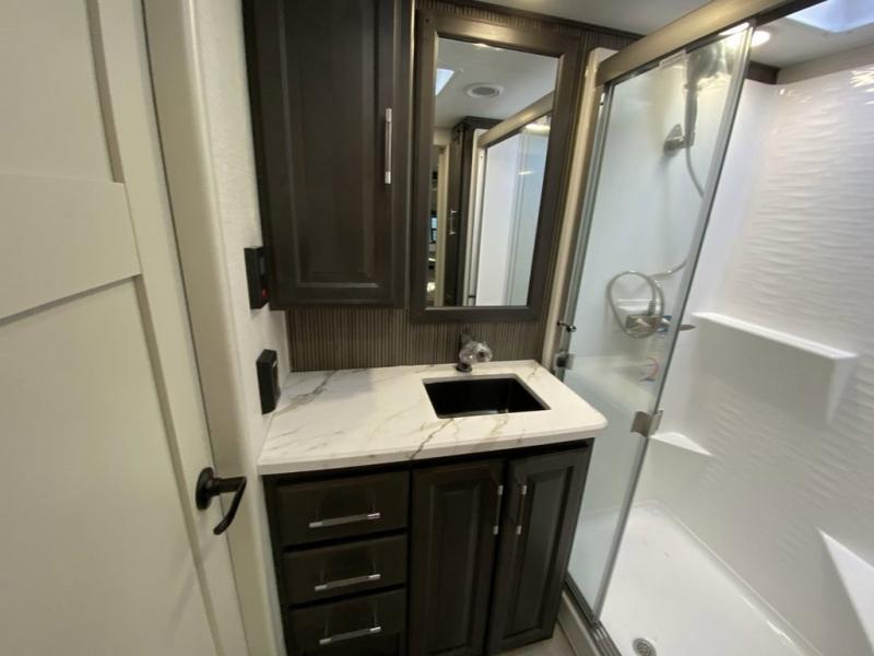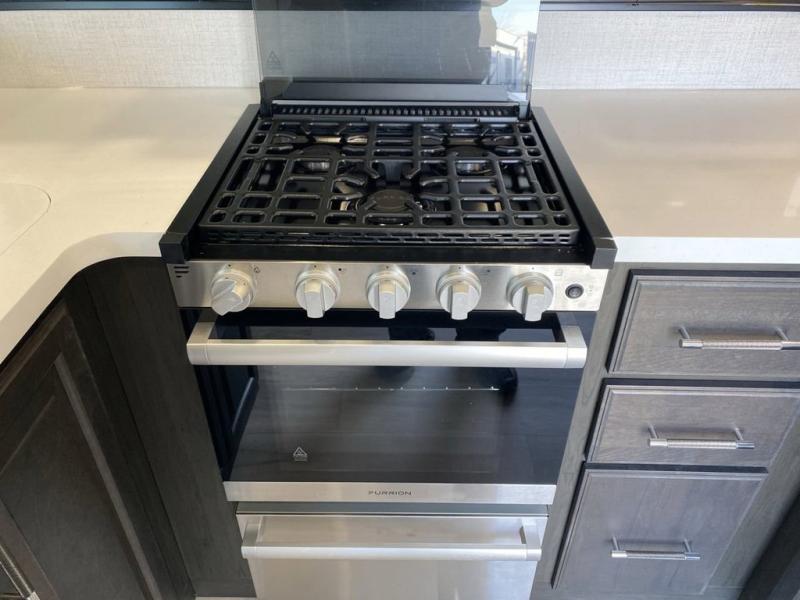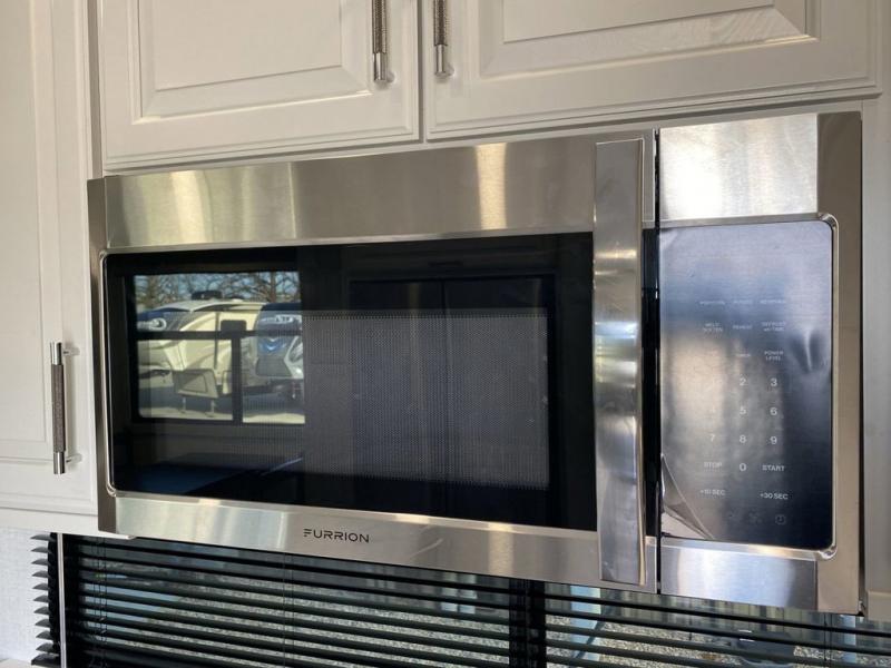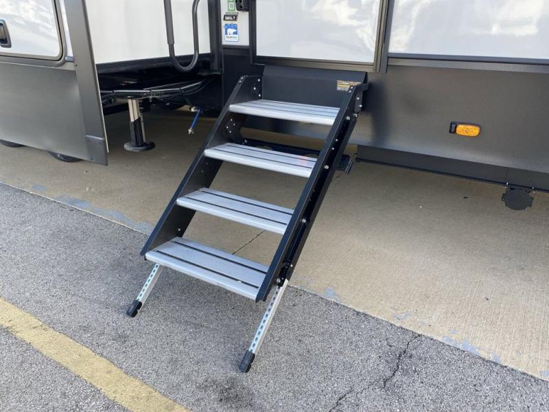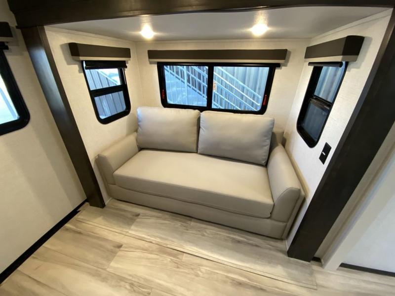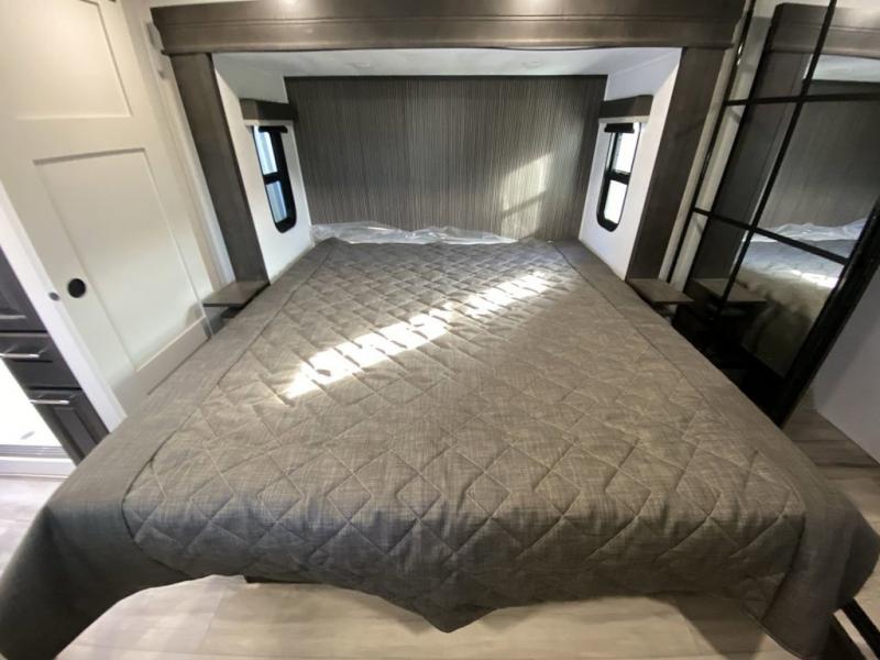 Are you looking for a spacious fifth wheel with space for you and your guests? Look no further than this four slide out unit with dual entry doors, a front master bedroom, and a rear bedroom/den with a loft! There is also a half bath here and a hide-a-bed sofa with storage underneath. You'll find the second hide-a-bed sofa in the living room, along with theater seating, a feature wall with a 50" TV, and a free-standing dinette with chairs where you can dine together. Furrion appliances in the kitchen let you create yummy meals each day, and there is a pantry and residential refrigerator to keep food stocked. Head to the front master bedroom where you can relax on the king bed slide out, store your clothes in the master closet, and easily use the dual entry bath. There is even stackable washer and dryer prep if you want the option to make laundry day easier!