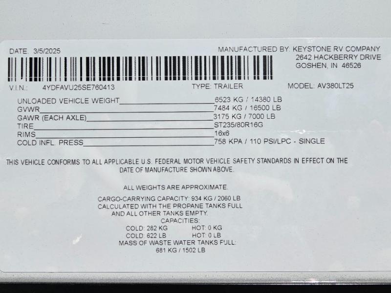 New 2025 Keystone RV Avalanche 380LT Fifth Wheel