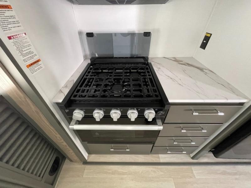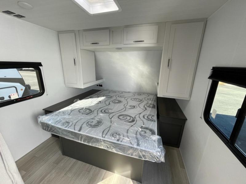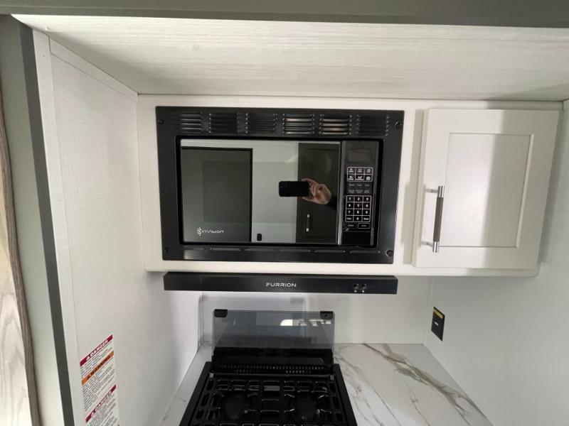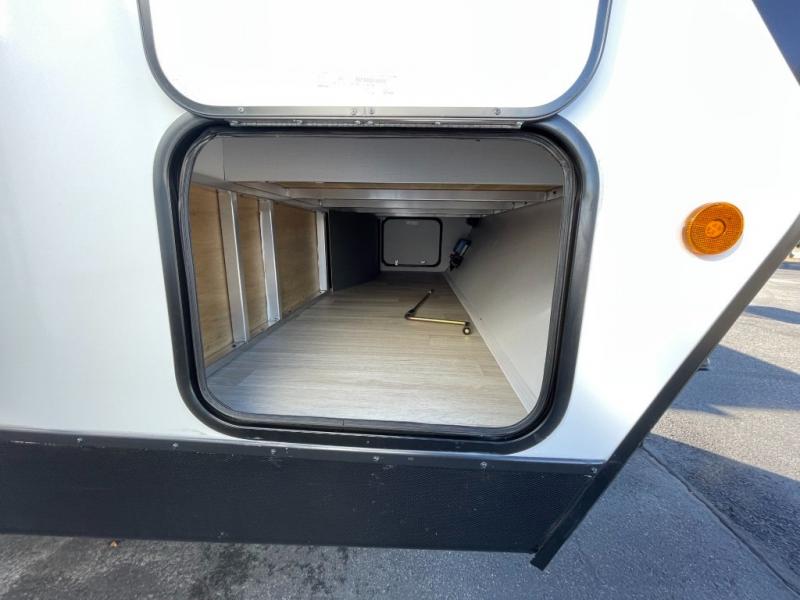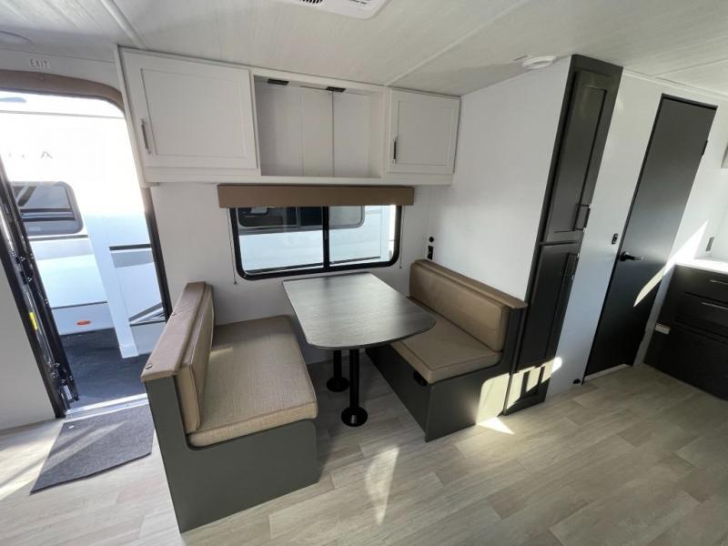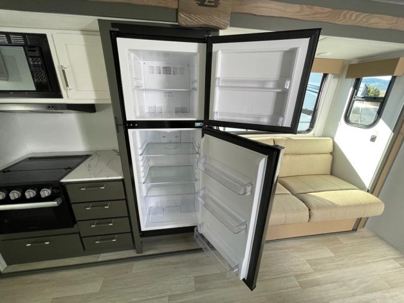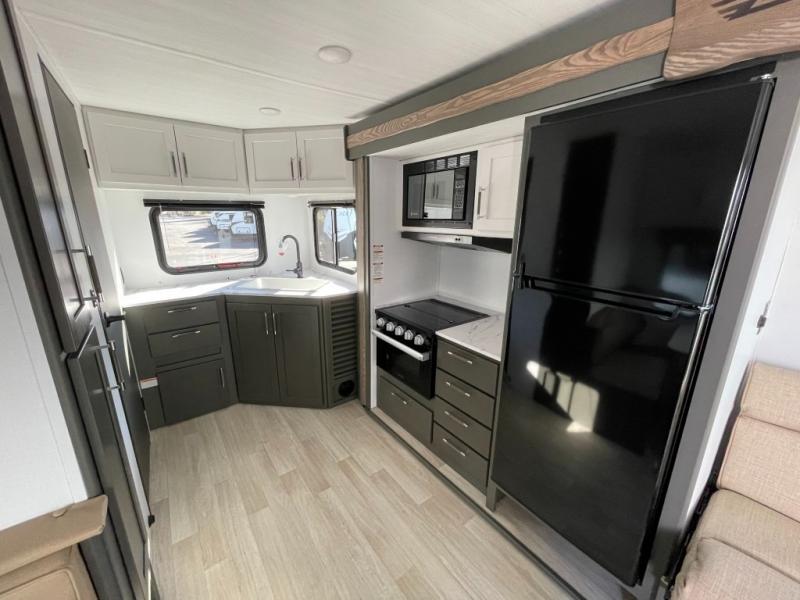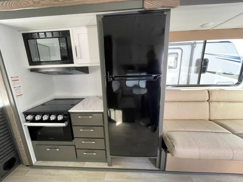 This travel trailer with a large slide out is sure to meet all your needs. When you arrive at the campground, you can put out the patio awning, unload the pass-thru storage, and relax in your camp chairs. The cooktop and microwave oven in the rear corner kitchen will let you make lunch for everyone, and the 8 cu. ft. refrigerator and pantry will help you keep food stocked. You will love having a queen bed to sleep on each night, and the booth dinette and jack knife sofa provide seating and sleeping space for guests!