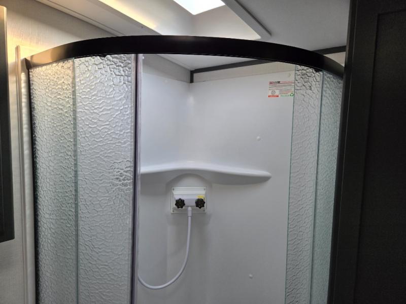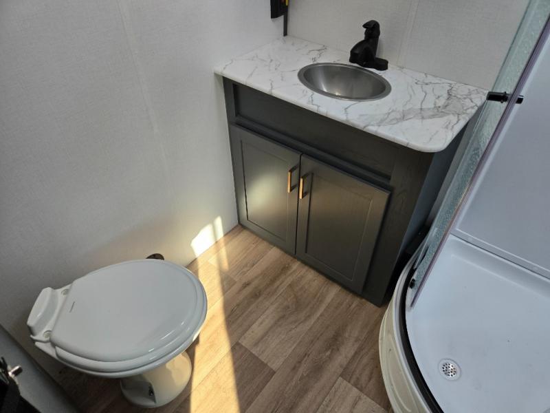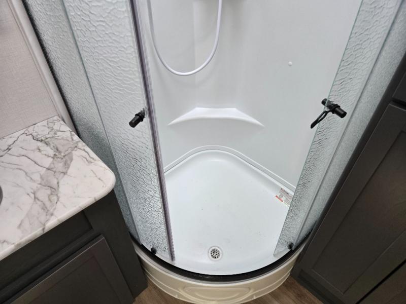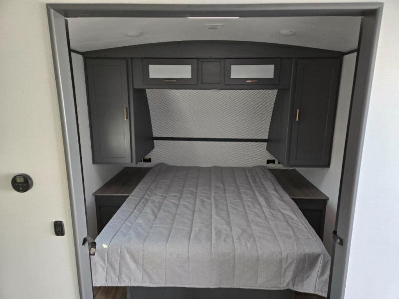 Enjoy camping with your family in this travel trailer that is perfect for a couple or a family of four. You will appreciate the private bedroom with wide entry including space saving sliding doors. The bedroom features a queen bed and wardrobes on either side to keep your clothes tidy. There is also a large pass-thru storage compartment beneath the front bedroom for your outdoor gear and more. A large slide features a Do-More dinette and 68" tri-fold sofa that is great for relaxing during the day, and can easily be transformed for more sleeping space at night. Or, you could opt. for the free standing dinette with chairs if you do not prefer booth style seating and/or do not need the added option of more sleeping space. A large rear bath features a radius shower and linen storage, plus a vanity with sink and toilet. And, the chef can choose to cook inside or outside with the outdoor kitchen that includes a Capital grill, 4.4 cu. ft. refrigerator as well as a sink all tucked under the 21' awning.